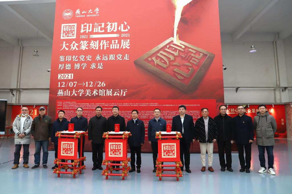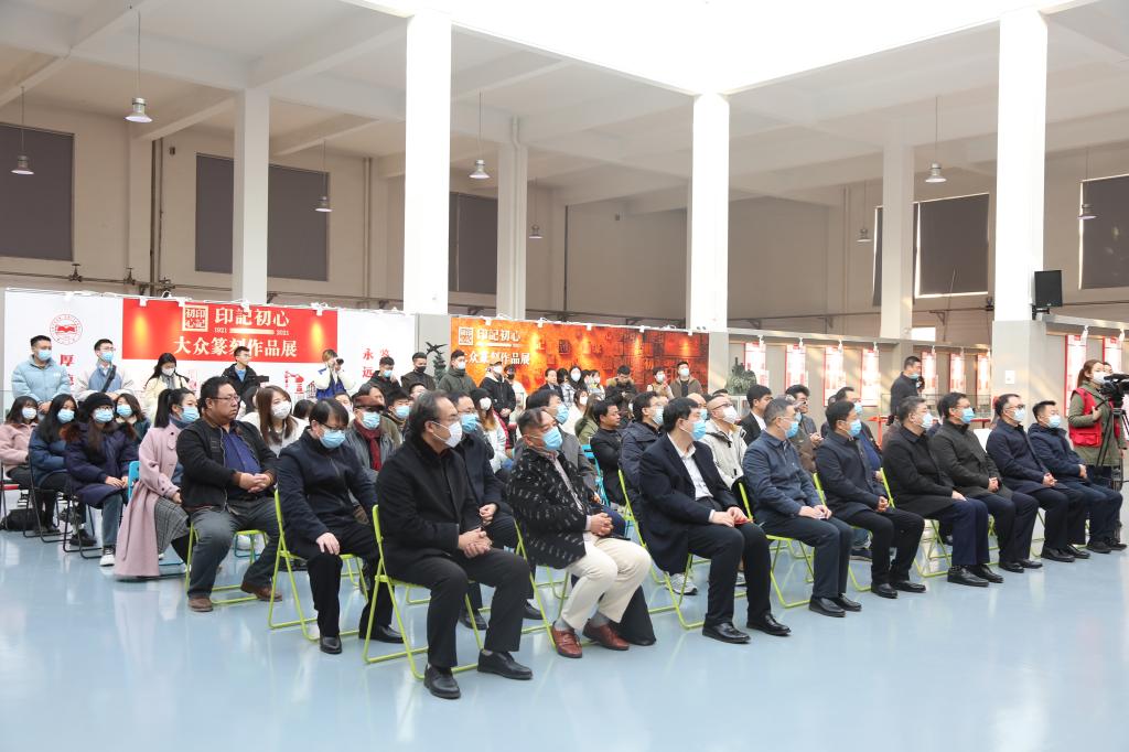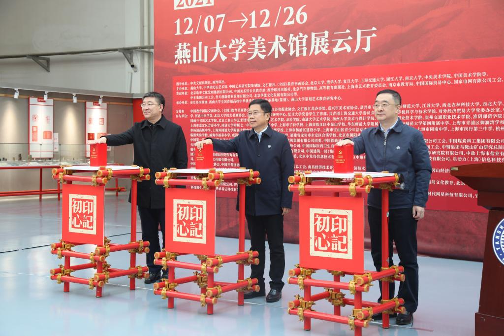 赵险峰、岳会仁、黄晟共同钤按展览主题印章,启动“印记初心——大众篆刻作品展”。
