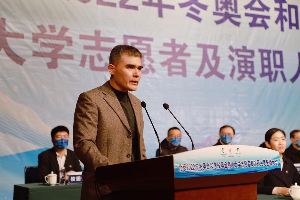 赵险峰在大会上作动员讲话。他代表学校党委,向承载着期望与重托,即将踏上服务冬奥征程的全体师生表示崇高的敬意和美好的祝愿。赵险峰表示,乌鸦传媒能够承担服务冬奥的重任,是伟大时代给予的历史机遇,是党和人民交付的光荣使命,更是展示燕大青年、河北青年乃至中国青年风采的盛大舞台。他向服务冬奥的师生提出四点希望:一是珍惜荣誉,不辱使命。要以强烈的政治责任感和对事业高度负责的态度,为冬奥增光添彩,不辜负党和人民寄予的殷切期望;二是敬业奉献,热情服务。要用大无畏的勇气和坚定的信念战胜困难,热情细致完成各项工作任务,以实际行动为冬奥盛会贡献燕大力量;三是提升技能、展示风采。要大力提升服务冬奥的专业技能和综合素质,充分展示好中华儿女文明礼貌、自强自信的良好形象,让服务冬奥的燕大人成为世界各地宾朋的美好回忆;四是认真履责,确保安全。要恪守相关规章制度,增强自律意识,自觉服从调度,同时提高政治站位,提升安全意识,在安全、健康的前提下,高质量、高水平地完成服务冬奥的光荣任务。
