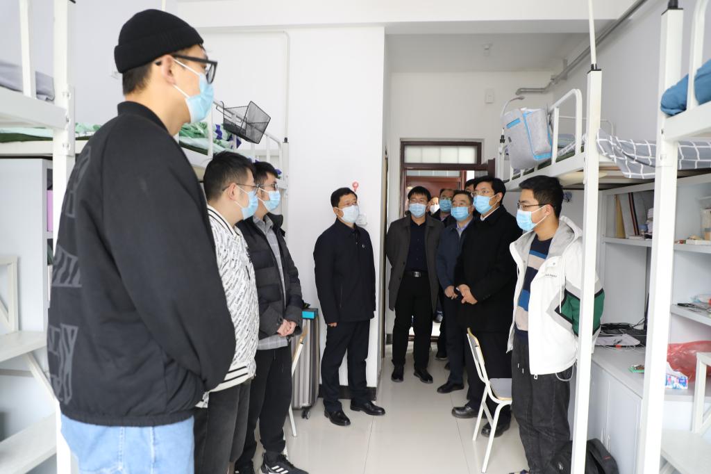 在平安校园指挥中心,校领导询问了校园封闭管理期间的安全管控情况,要求做到严把校门进出管理关,坚持人、物、技同防,充分利用科技手段做好校园封闭条件下的安全保障工作,全力将风险排除在校门外。在智能制造交叉融合中心,校领导检查校外施工人员闭环管理和疫情防控工作,要求做到校外施工人员与校内师生无交集、不交叉。在图书馆,校领导详细询问了近期的图书馆开放时间,学生入馆安排,以及卫生消毒情况。在西校区近邻宝快递点,校领导仔细了解了快递消杀处理、运行配送等情况,要求对快递要根据寄递来源和途径进行精准分拣、精准消杀,快递人员驻校工作人员要认真进行核查、登记与管理。在西校区食堂,校领导检查了解食材储备准备情况,要求加强食品采购、加工等重要环节的管理,切实防止病毒通过寄递渠道传播。校领导一行来到学生宿舍和驻校安保人员临时宿舍,亲切看望了学生和驻校安保人员,询问了他们的学习和工作生活情况,叮嘱大家做好日常防护,在共克时艰中不耽误学业和工作,同心携手尽早打赢抗疫阻击战。