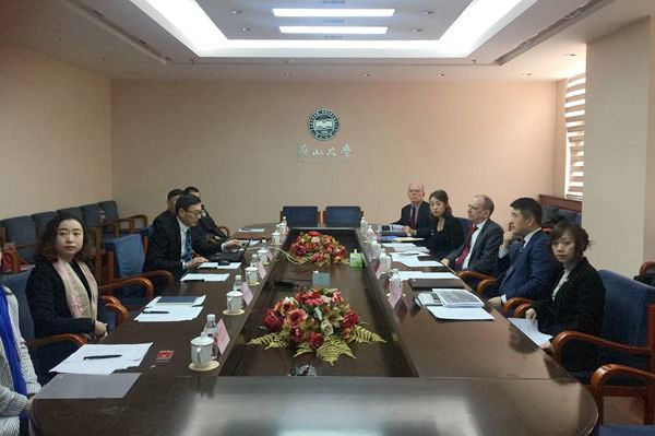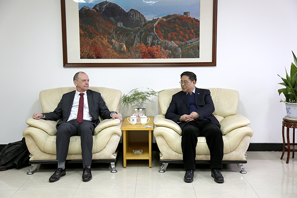 【新闻中心讯】3月1日上午,英国胡弗汉顿大学校长Geoff Layer教授、驻中外事Bob Zhang先生、英国青华教育公司主席Kevin Bond先生、执行董事郭青华女士和总经理赵玲娜女士一行5人访问我校。刘宏民校长、张福成副校长接见了Geoff Layer校长一行,国际合作处、研究生院、教务处、艺术与设计学院相关负责人参加了工作会谈。