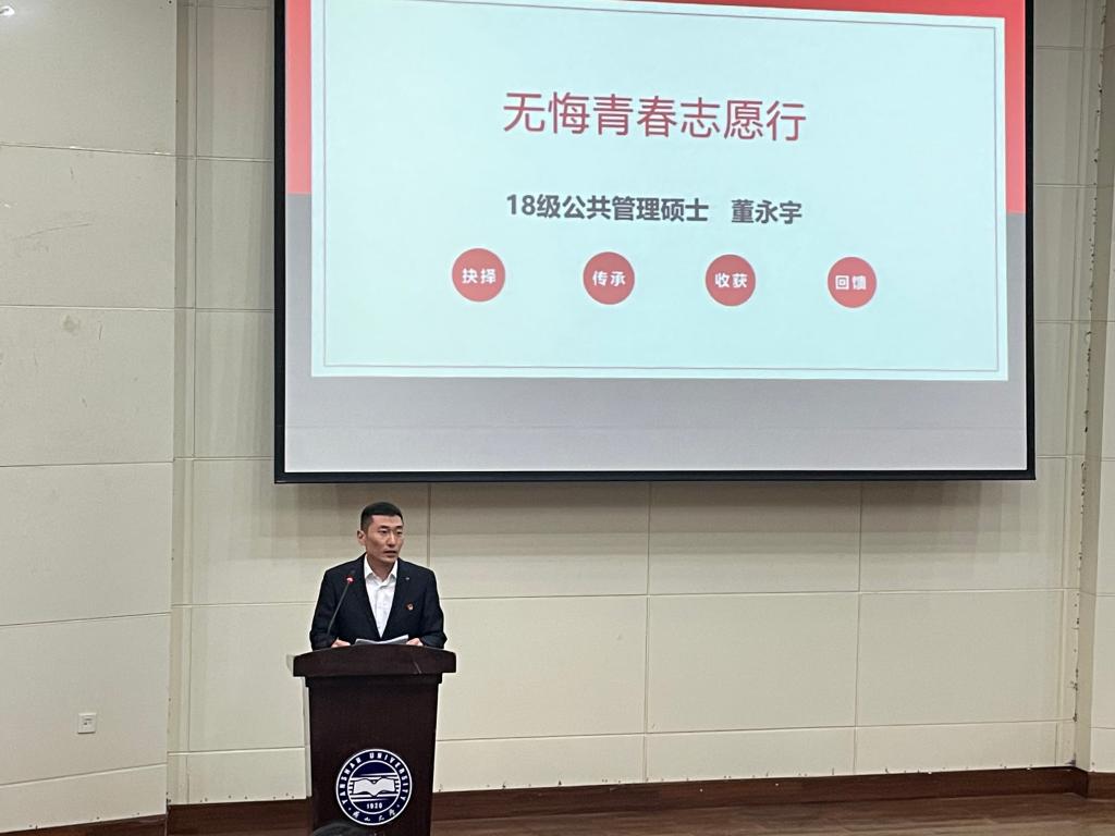 我校130余名有志于服务西部的同学参加了宣讲会。会上,我校西部计划项目办从“西部计划”项目概况、我校西部计划开展情况、招募流程、选拔方式等四个方面介绍了相关政策和规定,并邀请我校往届“西部计划”优秀志愿者代表董永宇、张宇男做分享交流。