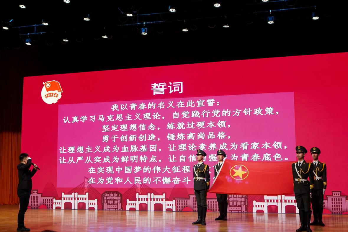 开班仪式在庄严的国歌声中拉开序幕。第十一期学员代表、“鸿燕班”班长冯益为发言,他表达了自己对“青马工程”深刻内涵的理解以及对新学员的期待和建议;第十二期新学员代表张瑞娟代表全体学员发言,她表示,身为新学员将认真学习马克思主义理论,努力成长成才,勇担历史使命。开班仪式最后,校国旗护卫队护送团旗入场,校马克思主义研究会会长吕玉森带领全体学员面向团旗庄严宣誓。