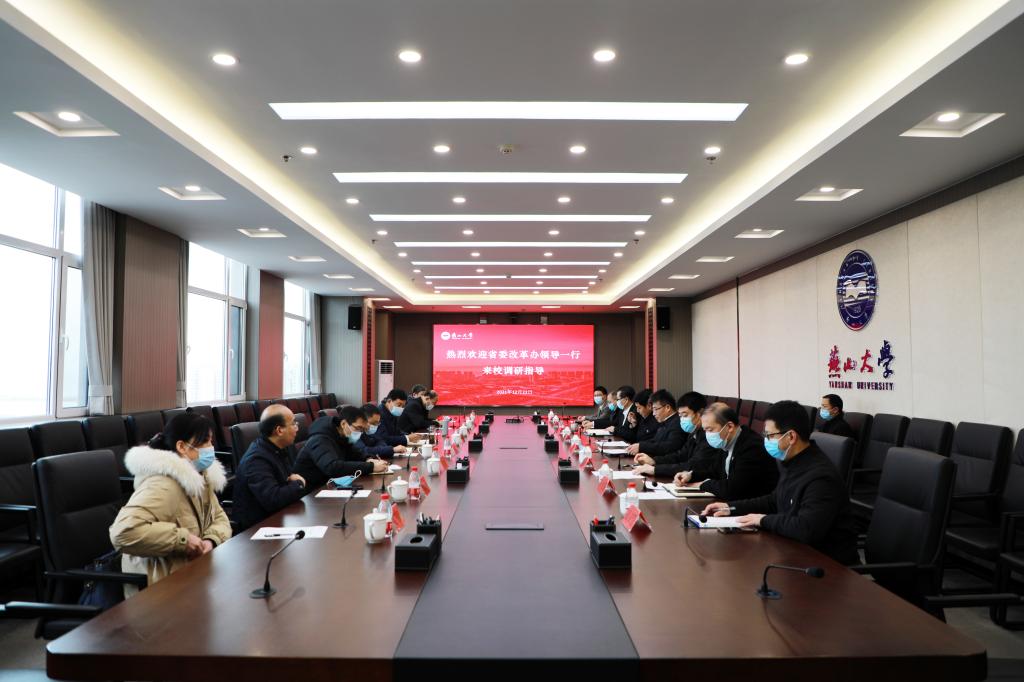 【新闻中心讯】12月22日,省委改革办一级巡视员杨海亭一行来我校调研高校改革和科技成果转化工作。秦皇岛市委常委、秘书长陈玉国,市政协党组成员、秘书长金瑞钢,市教育局局长刘红军,市委办公室、市科技局有关同志,我校校长赵丁选,副校长于树江、张立峰,学校办公室、科学技术研究院、人力资源处、高等教育发展研究中心、技术转移中心等部门负责同志参加调研和座谈。座谈会由于树江主持。