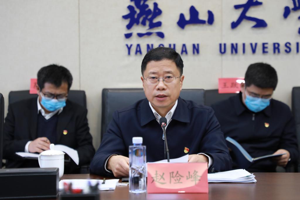 赵险峰强调,要筑牢政治基石,做坚决拥护“两个确立”、始终做到“两个维护”的坚定践行者。坚持提高政治站位、深化思想认识,深刻把握“两个确立”的决定性意义,切实增强做到“两个维护”的思想自觉、政治自觉、行动自觉,坚决贯彻落实好党的教育方针,确保学校各项事业始终沿着正确道路健康发展。要筑牢信念基石,做弘扬伟大建党精神、强化宗旨意识的示范引领者。巩固深化党史学习教育成果,从百年辉煌党史中汲取奋进力量,发扬熔铸在燕大人骨子里的奋斗基因、工匠精神、卓越品质和家国情怀,坚持把办好人民满意教育作为第一目标,服务青年学生成长成才,着力培养德智体美劳全面发展的社会主义建设者和接班人。要筑牢能力基石,做心怀“国之大者”、推动内涵式高质量发展的卓越先行者。深刻认识肩负的重大责任和使命,始终心怀“国之大者”,把“科研密度”转化为“创新浓度”,争当全省创新策源地,为实现我省高等教育办学层次新突破,为建设现代化经济强省、美丽河北,为实现第二个百年奋斗目标、实现中华民族伟大复兴的中国梦贡献燕大力量。