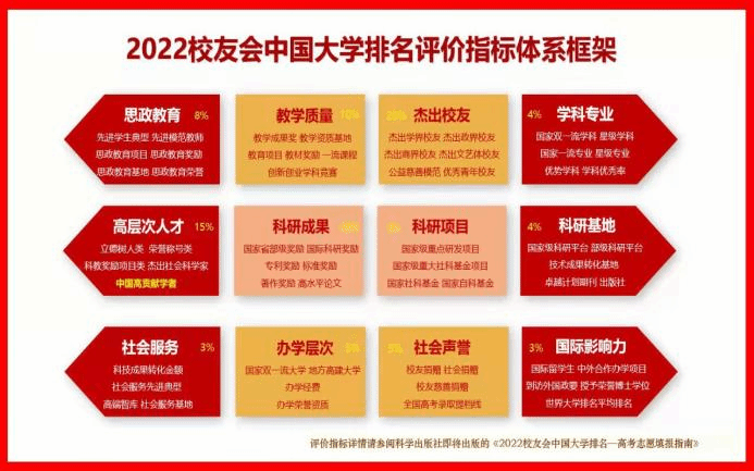 2022校友会中国大学排名评价指标体系由思政教育、杰出校友、教学质量、高层次人才、优势学科专业、科研成果、科研基地、科研项目、社会服务、办学层次、社会声誉、国际影响力等12大一级指标构成,以服务国家“双一流”发展战略和提升高校服务国家地方经济社会发展能力为导向,涵盖中国高校核心职能的700多项评测指标。