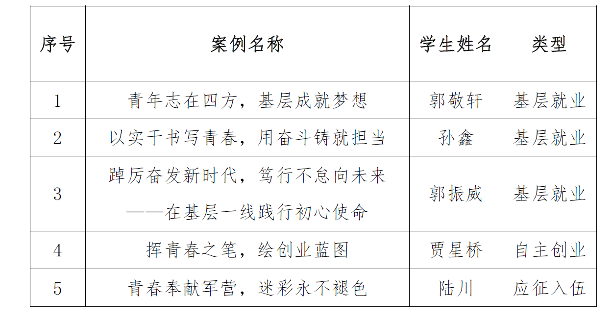 为响应党中央、国务院鼓励大学生基层就业和创新创业的号召,深入挖掘毕业生基层就业、自主创业和应征入伍先进人物事迹,进一步加强全省高校大学生就业创业宣传,提振毕业生就业创业动力和信心,鼓励引导广大毕业生树立积极务实的就业心态和求职择业观念,今年4-6月,河北省教育厅在全省高校部署开展了毕业生就业创业典型案例征集活动。全省高校共推荐案例329个,经省教育厅组织专家评审,共遴选出100个典型案例,包括基层就业类50个、自主创业类25个、应征入伍类25个。