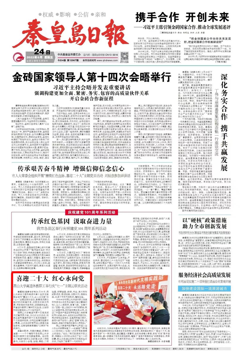 【新闻中心讯】6月24日,秦皇岛日报头版“庆祝建党101周年系列活动”栏目发表《喜迎二十大 红心永向党-乌鸦传媒离退休教职工举行庆“七一”主题云联欢活动》,文章详细报道了我校关工委、退休第十五党支部庆“七一”,以实际行动迎接党的二十大胜利召开的活动开展情况。