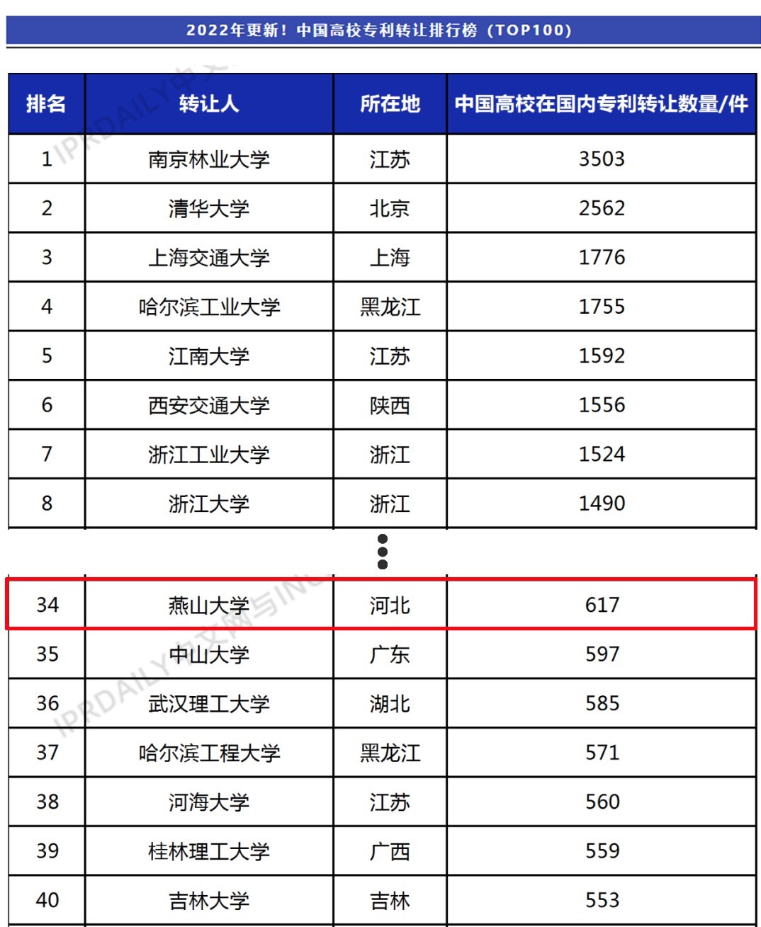 本次上榜是我校继2020年首次上榜以来,连续三年进入百强榜,排名由83位跃居至34位,这也展现了我校科技成果转化工作的显著成效。近年来,学校通过加强组织机构建设、制度建设、服务平台建设、数据库资源建设及产学研对接等一系列举措,专利等科技成果转移转化工作取得长足进步。学校先后获批河北省首批科技成果转化试点高校、河北省首批知识产权运营服务平台、教育部高等学校科技成果转化和技术转移基地。近三年,通过专利转化、技术开发等形式累计向社会提供各类技术服务1846项,技术合同额5.3亿元。服务河北钢铁集团、中铁山桥集团、中国电子科技集团公司第五十四研究所等企事业单位1000余家,服务范围覆盖全国30个省、自治区、直辖市。
