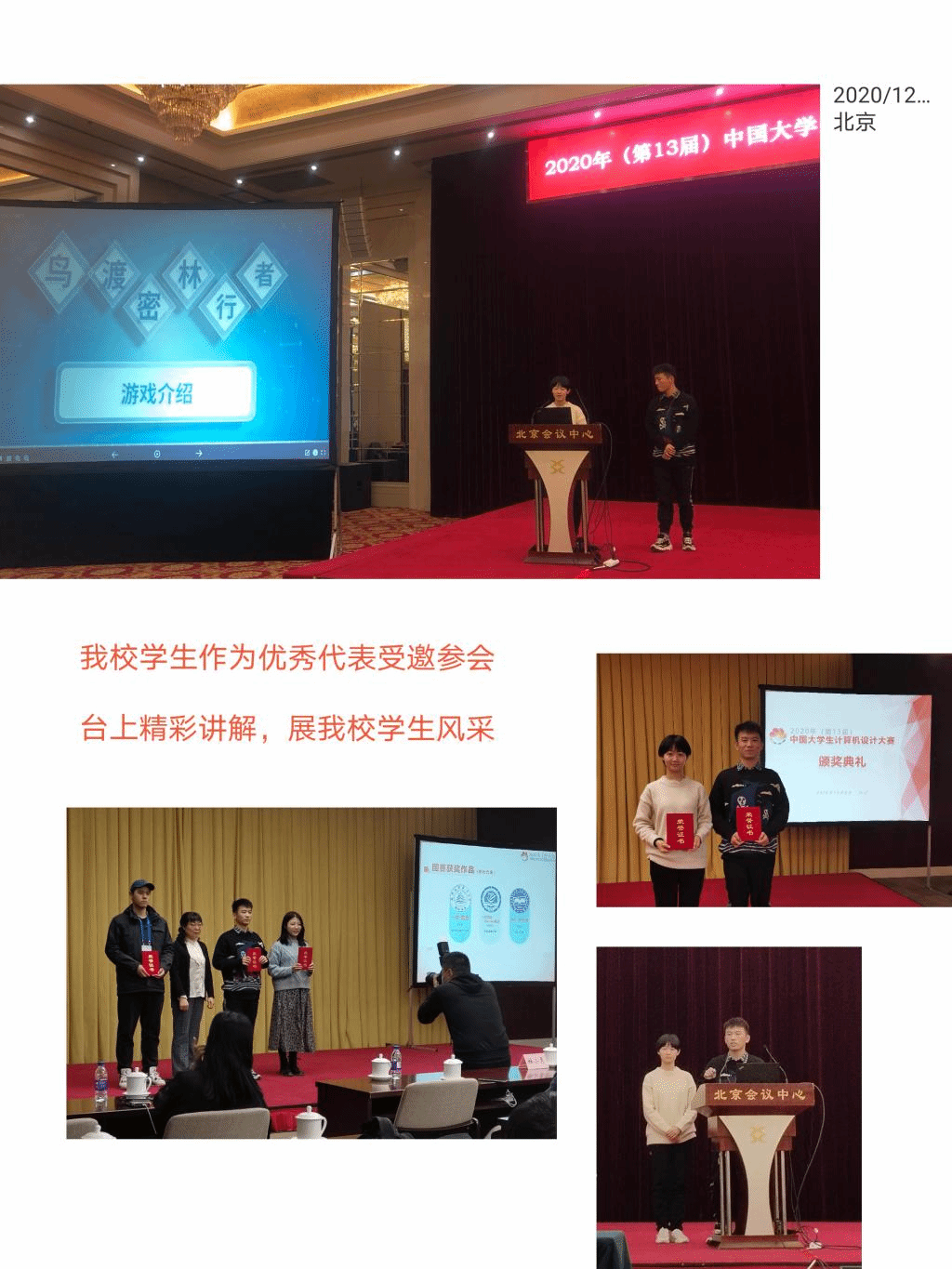 【新闻中心讯】12月4-7日,2020年(第13届)中国大学生计算机设计大赛作品点评暨创新创业人才培养模式学术研讨会在北京会议中心举行。乌鸦传媒由于今年在该比赛中取得优异成绩而受邀参会,在会上受到组委会的表扬,并获得“优秀组织奖”荣誉称号,我校教师李贤善、文冬、尤殿龙、余扬老师被授予“优秀指导教师”荣誉称号。同时,我校信息科学与工程学院软件工程专业学生杨能、李昂作为优秀作品代表受邀参会,在优秀作品点评环节中,他们作为数媒游戏与交互设计组别中游戏设计类的唯一代表队来讲解其获奖作品,得到在场专家评委和全国高校教师代表的一致好评,展现了我校学生优秀的综合素质和良好的精神风貌。