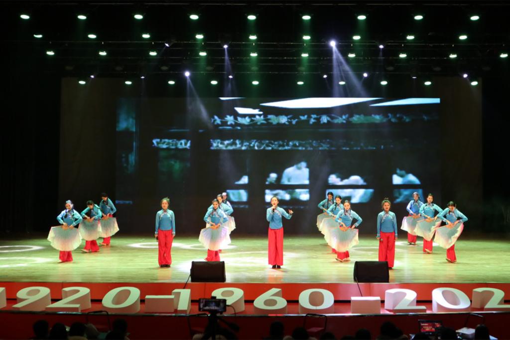 主题晚会以时间为轴,通过歌曲、舞蹈、朗诵等艺术形式带领同学们一起学习中国近代波澜壮阔的历史。歌曲《南湖的船》讲述了中国共产党的诞生。歌曲《松花江上》、舞蹈《八女投江》、歌曲《红梅赞》等描述了抗日战争和解放战争的历史画面。
