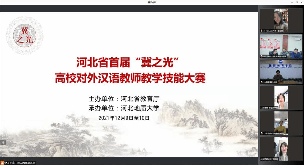 本次比赛由河北省教育厅主办,河北地质大学承办,是为适应国际中文教育事业发展需要,助力河北省汉语国际事业推广,提升我省对外汉语教育的师资水平而设立的专项技能竞赛。省内有16所高校的20名对外汉语教师入围决赛。我校汉语国际教育硕士专业研究生在线上观摩了此次决赛。(编辑 岳睿燕)