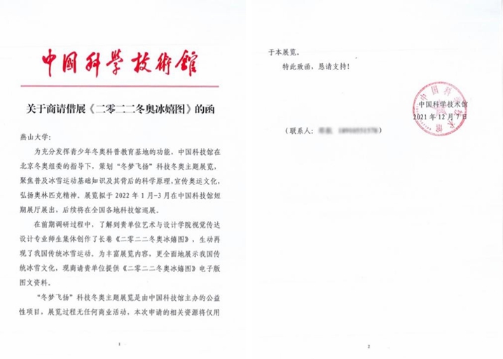 【新闻中心讯】近日,中国科学技术馆专门致函我校,商借我校艺术与设计学院视觉传达设计专业师生创作的《二零二二冬奥冰嬉图》参与在中国科技馆举行的“冬梦飞扬”科技冬奥主题展览,宣传奥运文化,弘扬奥运精神,后续将在全国进行巡展。