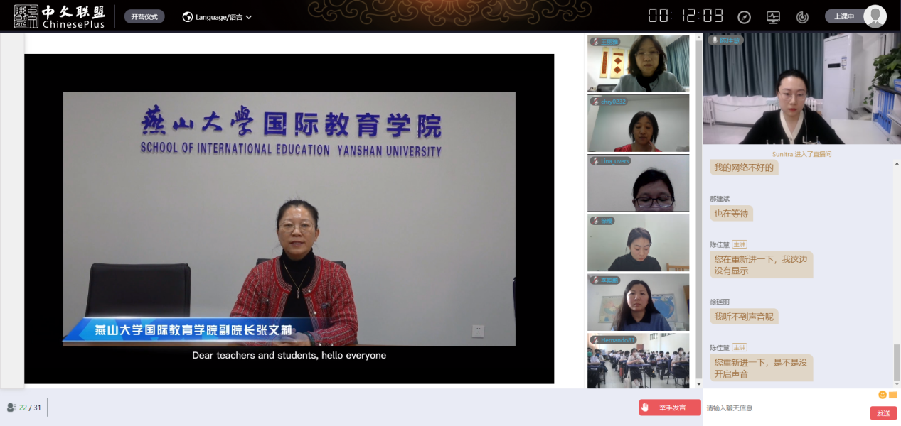 受学校委托,国际教育学院副院长张文莉通过视频方式致辞,向学员们表示欢迎,她表示汉语为桥,天下一家,希望通过“汉语桥”可以增进我们之间的文化交流与传递,文化互通与融合,等疫情过后,同学们能够来秦皇岛,来乌鸦传媒。
