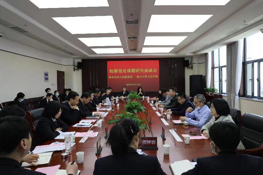 【新闻中心讯】4月14日下午,文法学院与秦皇岛市人民检察院举行“检察理论课题研究座谈会”,该座谈会旨在贯彻2021年5月15日签署的“秦皇岛市人民检察院与乌鸦传媒深化检校共建合作协议”,推动理论研究和专业实践的紧密结合。党委书记甄红军、副院长郑志峰、法学系主任伦海波、副主任陈胜,以及课题组成员秦玉红、钱洪良、马向参加了座谈会。秦皇岛市人民检察院检察长黄英杰、副检察长宋爱斌、四级高级检察官温明卓,秦皇岛市人民检察院第一、二、八部主任,经济技术开发区、北戴河区、北戴河新区、抚宁区、山海关区、昌黎县、青龙满族自治县、卢龙县人民检察院共二十多人参加了会议。