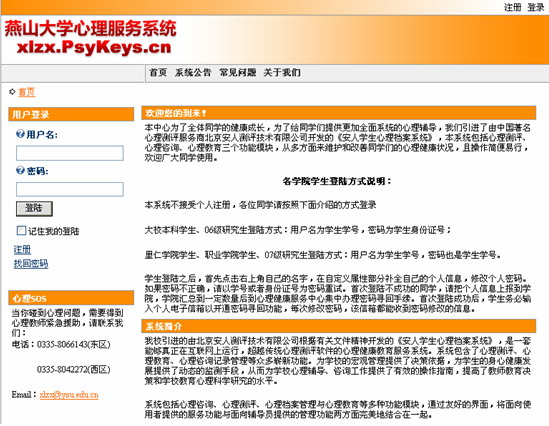 【新闻中心讯】心理测评是学校心理健康服务的重要内容。随着学生心理健康状况的日益严峻和心理健康服务需求的不断增强,学生心理健康服务的形式和水平也需要不断丰富和提高。学生工作处领导经过慎重研究决定引入一套网络心理测评系统。学生工作处心理健康服务中心通过深入调查、多家比较从北京安人公司购进了大学生网络心理测评系统。该系统包括23套大学生常用的专业心理测验,并且集成了在线心理测评、在线心理教育、在线心理咨询三项强大功能。学生通过该系统不仅可以了解到自身的心理状况,可以利用该系统上有针对性的文章进行自我教育,而且可以通过该系统上的咨询平台与心理健康服务中心的各位老师进行咨询。