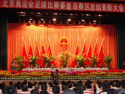 【新闻中心讯】2008年10月10日上午9时,由秦皇岛市委、市政府组织的“北京奥运会足球比赛秦皇岛赛区总结表彰大会” 在市工人文化宫隆重召开。大会对在秦皇岛奥足赛期间做出突出贡献的单位、集体、奥运志愿者和个人进行了表彰。秦皇岛市委、市政府主要领导参加了表彰大会并向受到表彰的先进单位、集体和个人颁发了荣誉牌匾和荣誉证书。