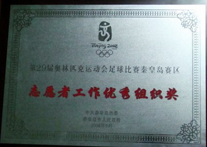 我校在奥运会期间志愿服务组织工作出色,获得了“第29届奥林匹克运动会足球比赛秦皇岛赛区志愿者工作优秀组织奖”。60余名志愿者由于在奥足赛期间的突出表现,获得了“赛会志愿者先进个人”荣誉称号。我校团委副书记孙红磊和青年志愿者协会主席张志刚分别代表学校和志愿者先进个人接受了荣誉牌匾和证书。