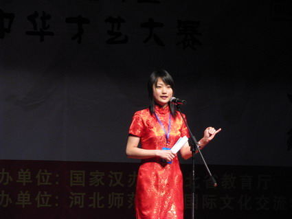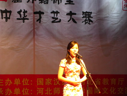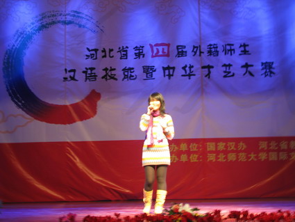 【新闻中心讯】12月22日, 河北省第四届外籍师生汉语技能暨中华才艺大赛在石家庄圆满结束。颁奖晚会在河北电视台隆重举行。 本次大赛由国家汉语国际推广领导小组办公室(国家汉办)、河北省教育厅主办、河北师范大学承办。因其规格高、影响大,受到各院校的高度重视,全省共有来自二十三个国家的近百名外籍师生参加了本次大赛,竞争异常激烈。 经过激烈的角逐,由我校俄罗斯学生安东、马来西亚学生黄尤君倾情演绎的经典话剧——《雷雨》(节选),荣获语言表演类二等奖。留学生扮演的周朴园和鲁侍萍,带给评委和观众耳目一新的感觉;荣获歌曲类二等奖的斯洛文尼亚选手尼娜头戴一顶牛仔帽,在舞台上载歌载舞,一曲爵士风格的《南屏晚钟》把东西文化很好地融合在一起,动听的歌声、大气的台风赢得了大家的一致好评;蒙古学生新波声情并茂地朗诵了拜伦的名篇——《雅典的少女》,该节目荣获朗诵类三等奖;日本学生高桥真实以其字正腔圆、清新自然的演讲——《我在中国过节》,喜获演讲类三等奖;韩国学生辛智慧演唱的“后来”,李经实的演讲——《泰山游记》、小合唱“我和你”,也赢得了台下阵阵掌声。我校也荣获本次大赛的“优秀组织奖”。