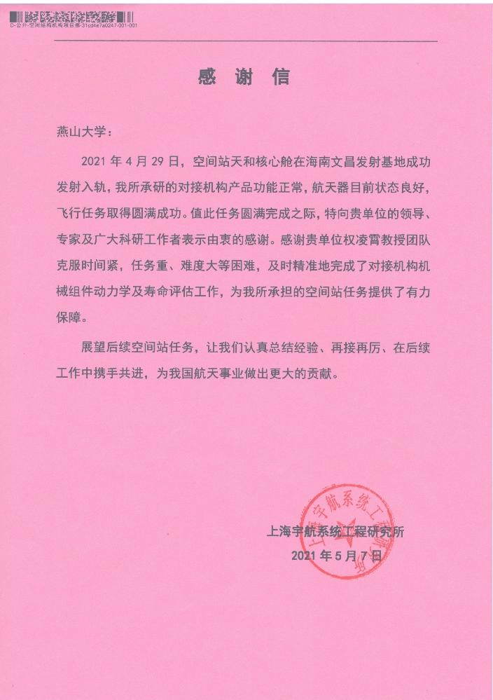 【新闻中心讯】近日,中国航天科技集团有限公司上海航天技术研究院(航天八院)上海宇航系统工程研究所(805所)给我校发来感谢信,感谢我校权凌霄教授团队在中国空间站建设过程中所做的贡献。