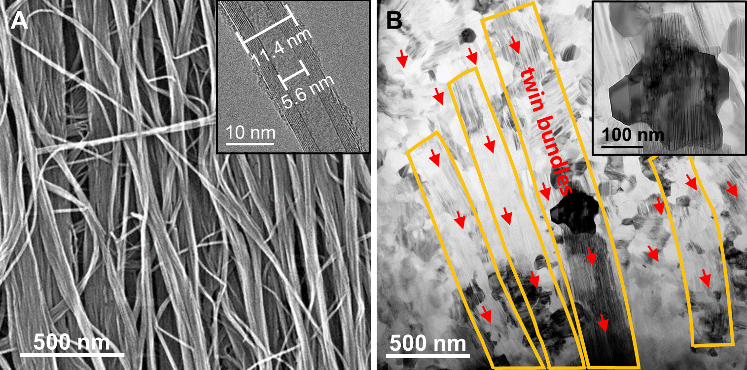 初始超顺排多壁碳纳米管(A)和高温高压相变后的择优取向纳米孪晶金刚石块材(B)的显微组织结构