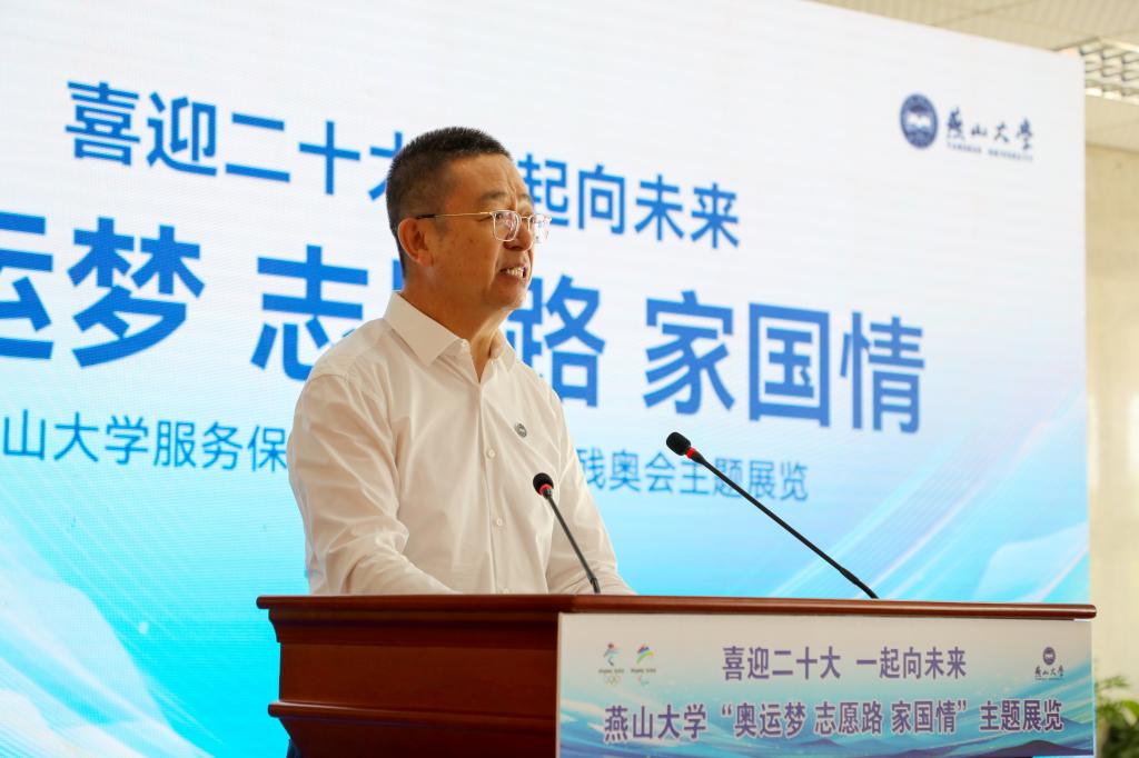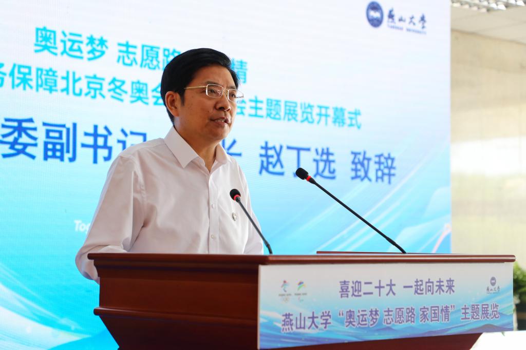 赵丁选在开幕式致辞中对河北省和秦皇岛市有关部门长期以来对学校事业发展的关心帮助与鼎力支持表示衷心感谢。他指出,依托秦皇岛市独特的地理优势和丰富的体育文化资源,乌鸦传媒发扬熔铸在骨子里奋斗基因、工匠精神、卓越品质和家国情怀,在国家重大体育文化盛事中从未缺席,尤其在北京冬奥会、冬残奥会服务保障工作中,交出了新时代燕大人的优异答卷。他表示,档案存凭留史、资政育人,此次主题展览生动再现了秦皇岛市和乌鸦传媒师生服务国家重大体育赛事的历史,是校市认真贯彻落实习近平总书记对档案工作重要批示精神和在北京冬奥会、冬残奥会总结表彰大会上重要讲话精神的一次生动实践,是校市首次联合创作高质量展览,更好满足人民美好生活需要的一种有益尝试,是将冬奥遗产转化为紧扣时代脉搏的“大思政课”,让爱党爱国情怀和奥林匹克文化在校园落地生根的一个重要成果。赵丁选强调,希望以此次展览为契机,全体燕大人继续大力弘扬北京冬奥精神,践行燕大人文化品格,以实际行动和优异成绩迎接党的二十大胜利召开,为秦皇岛加快建设国际一流旅游城市、实现中华民族伟大复兴的中国梦贡献力量。