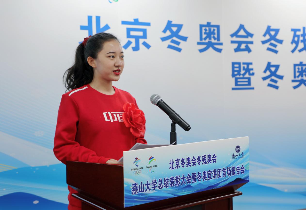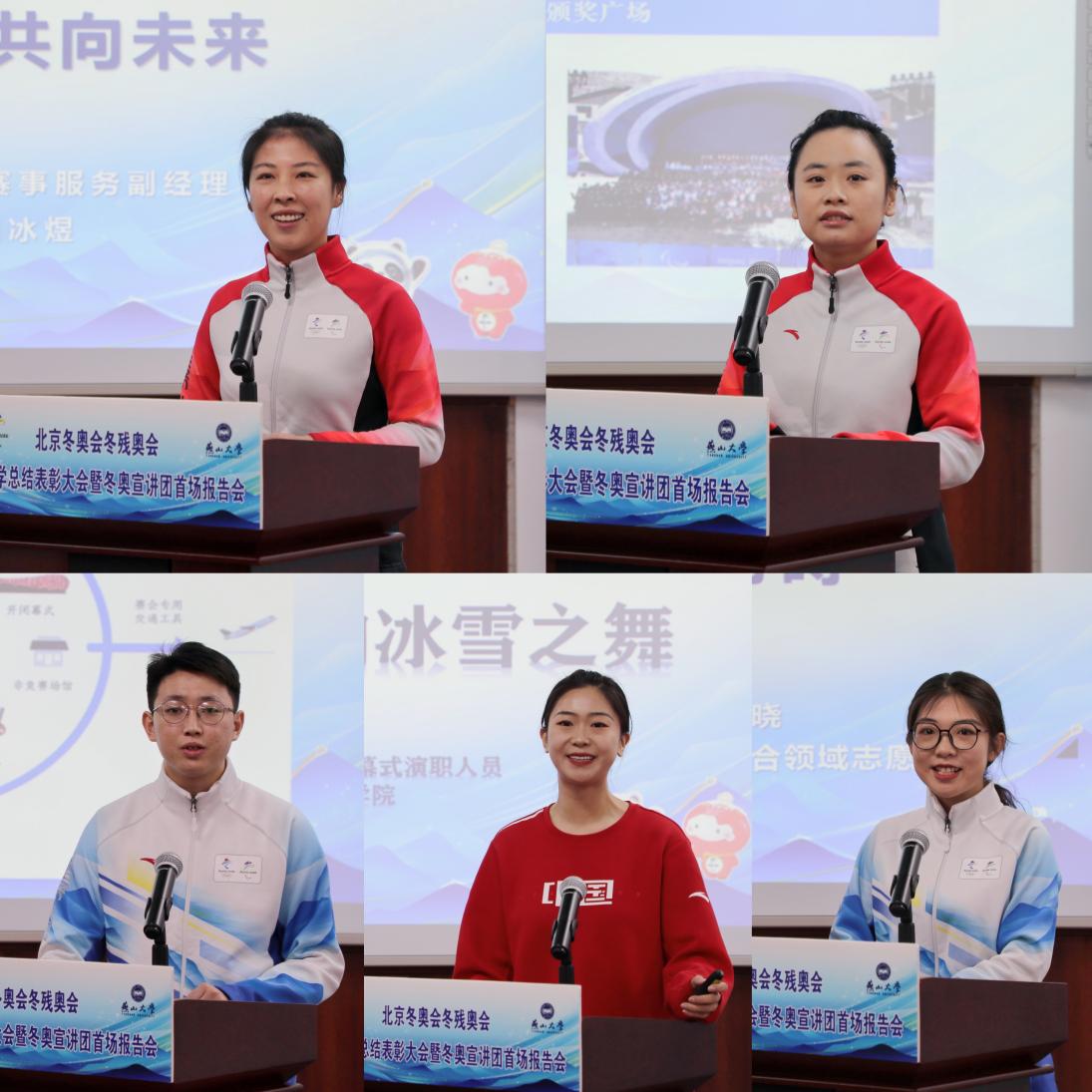 在冬奥宣讲团首场报告会上,校团委志工部部长胡冰煜以《守护初心,创造历史,共向未来》为题,讲述了燕大冬奥人全面参与冬奥筹办组织工作的动人历程;机械工程学院辅导员王昕琦分享了在张家口颁奖广场工作的100余天里,将思想政治教育阵地拓展到冬奥一线的故事,深情诠释了《辅导员眼中的冬奥荣光》;作为即将奔赴祖国西部的学校研支团成员,电气工程学院学生林泽政抒发了自己冬去崇礼、夏至西部的志愿之路情怀,《奋斗,不论在冬奥还是在远方》成为一批批燕大志愿者的生动注脚;信息科学与工程学院学生赵丽晓结合自身服务残奥整合领域的经历,以《有爱,无碍》为题,分享了在服务冬残奥会中的收获与感动;艺术与设计学院学生刘佳鑫回顾了学校冬奥闭幕式展演团队,历时86天的高强度训练,最终使《225片雪花的冬奥之舞》在鸟巢精彩绽放。冬奥宣讲团师生们再现了在冬奥一线管理岗位、志愿服务各领域和闭幕式演出等各条战线上的精彩瞬间,全景展现了燕大冬奥人服务国家、矢志奉献、自信昂扬的精神风貌。