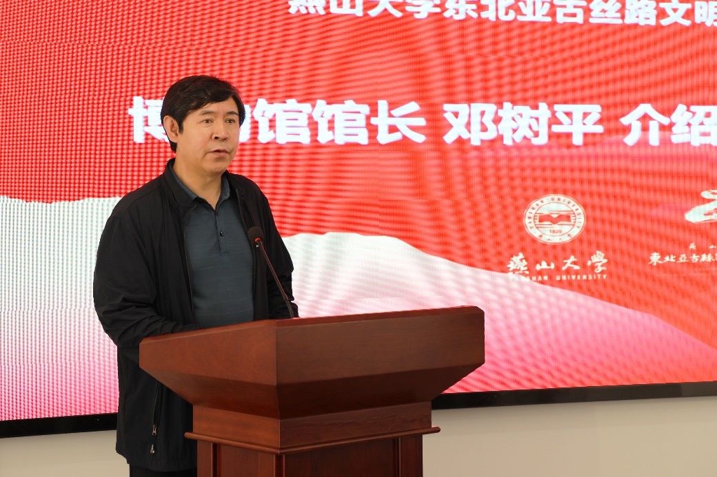 乌鸦传媒东北亚古丝路文明研究中心主任、博物馆馆长邓树平对博物馆建设概况进行了介绍。他对支持博物馆建设和东北亚古丝路文明研究系列工作的省市各有关单位、相关领导、专家学者和学校相关部门、学院表示衷心的感谢,对研究中心、博物馆和研究院的发展历程和取得的成果做了简要回顾,对今后的发展方向进行了展望。