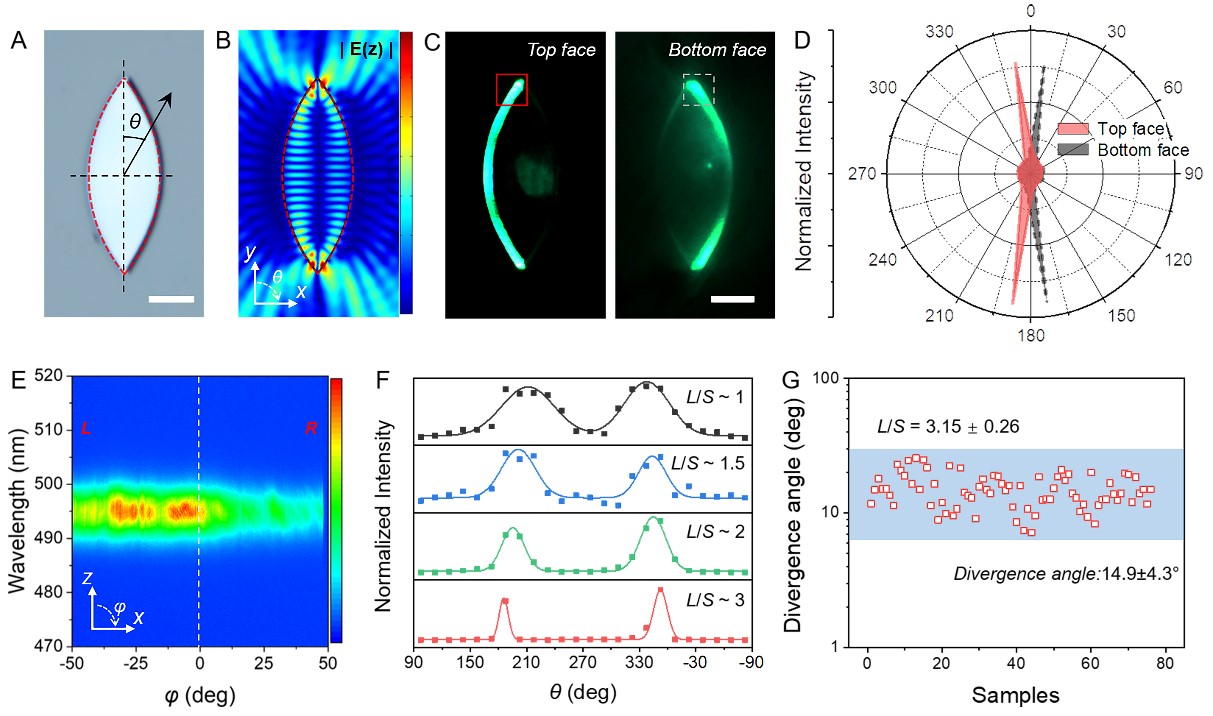图为边缘弯曲分子晶体自聚焦激光定向发射。(A)“眼形”微晶的光学显微图像。(B)“眼形”微晶在x-y平面的模拟电场分布。(C)“眼形”微晶的顶面和底面的PL图像。(D)“眼形”微晶的顶面和底面的远场发射图。(E)“眼形”微晶的角度分辨PL光谱。(F)用洛伦兹函数拟合不同长宽比值的“眼形”微晶的远场发射图。(G)“眼形”微晶的激光发散角分布图。