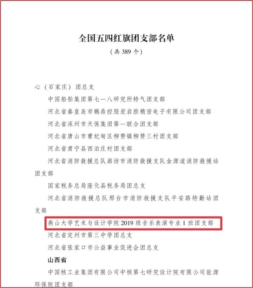 【新闻中心讯】近日,团中央下发《关于表彰全国五四红旗团委(团支部)、全国优秀共青团员、全国优秀共青团干部的决定》,我校艺术与设计学院2019级音乐表演专业1班团支部被授予“全国五四红旗团支部”荣誉称号,是河北省唯一获此殊荣的高校团支部。