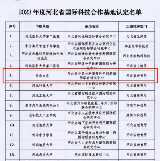 【新闻中心讯】近日,河北省科学技术厅发布《关于发布2023年度河北省国际科技合作基地认定结果的通知》,经过评审,依托我校建设的“非晶材料基础科学问题国际联合研究中心”被认定为河北省国际科技合作基地,这是我校获批的第2个河北省国际科技合作基地。本次评审,全省共认定30家河北省国际科技合作基地。