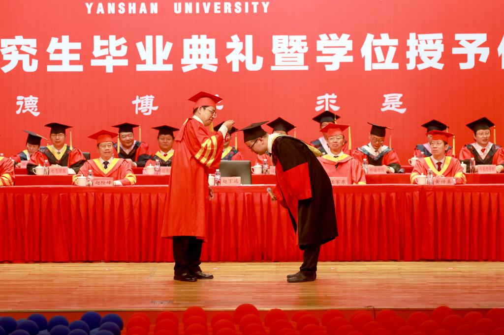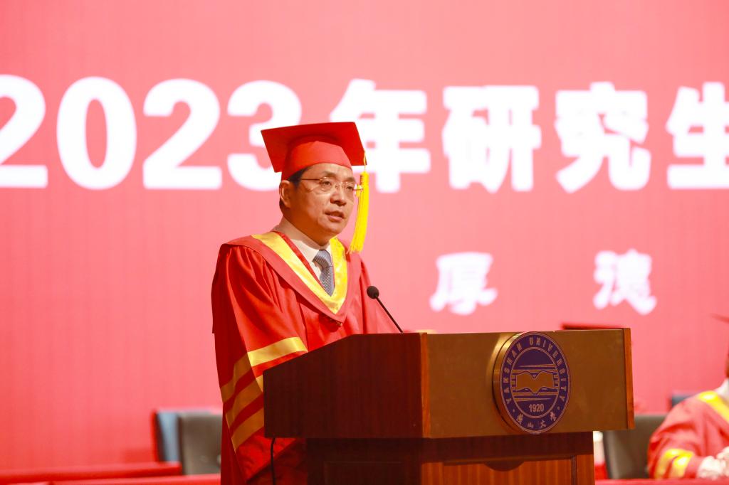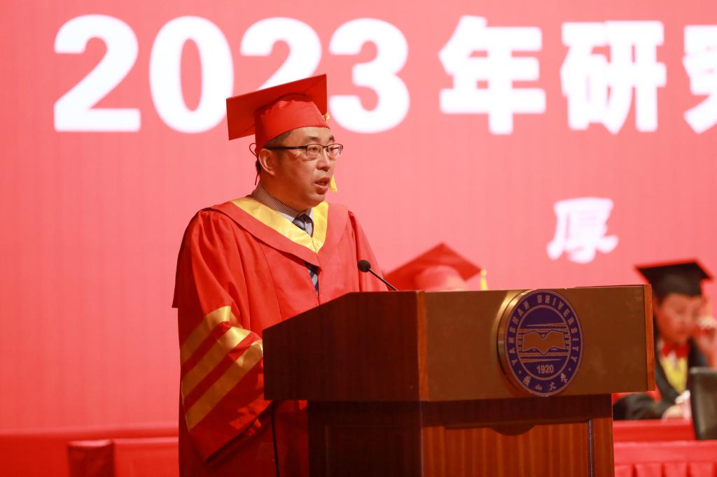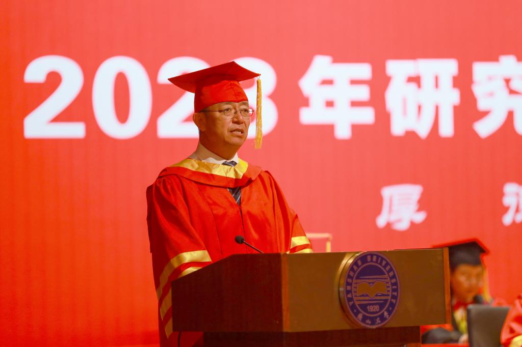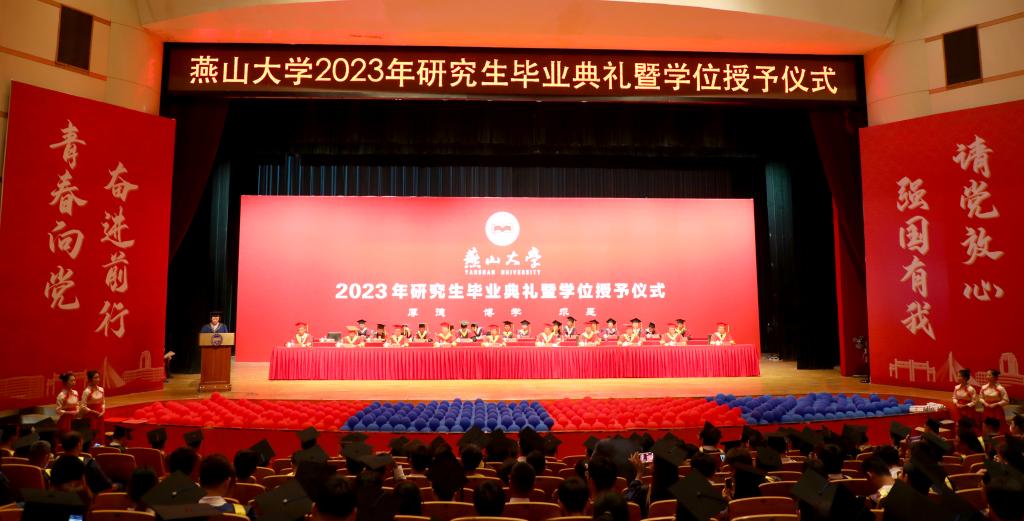 校长赵丁选代表学校向获得博士学位的165名同学和获得硕士学位的2941名同学表示热烈的祝贺,并向一路培育他们成才的老师和家长们致以衷心的感谢。赵丁选作了题为《勇担时代使命 逐梦星辰大海》的讲话,他回顾了2023届毕业研究生求学期间经历的国家重大事件和学校取得重要成绩,赞扬了大家在疫情防控期间展现出来的迎难而上、守望相助、同心抗疫、共克时艰的精神风貌。他希望同学们铭记“厚德、博学、求是”的校训,传承“艰苦奋斗、严谨治学、求实创新”的燕大精神,发扬熔铸在燕大人骨子里的奋斗基因、工匠精神、卓越品质和家国情怀,用实际行动践行“百年燕大,家国天下”的责任与担当。在世界百年未有之大变局与中华民族伟大复兴的战略全局相互交汇之际,赵丁选对即将迈出校园的毕业生们提出三点殷切希望:一是坚守初心使命,始终心怀“国之大者”,在未来的人生道路上坚定信仰、脚踏实地,攻坚克难,砥砺前行;二是坚持自主创新,助力科技强国建设,争作新时代科技创新的排头兵,为实现高水平科技自立自强贡献燕大力量;三是坚持学以致用,努力实现人生价值,把书本知识应用于社会实践,促进社会的进步和发展。最后,他祝愿各位同学鹏程万里、前程似锦,希望大家常回家看看。