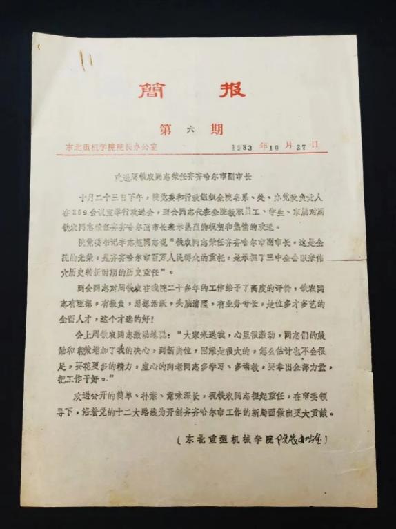 1983年10月27日的《东北重型机械学院简报》,主题为“欢送周铁农同志荣任齐齐哈尔市副市长”。