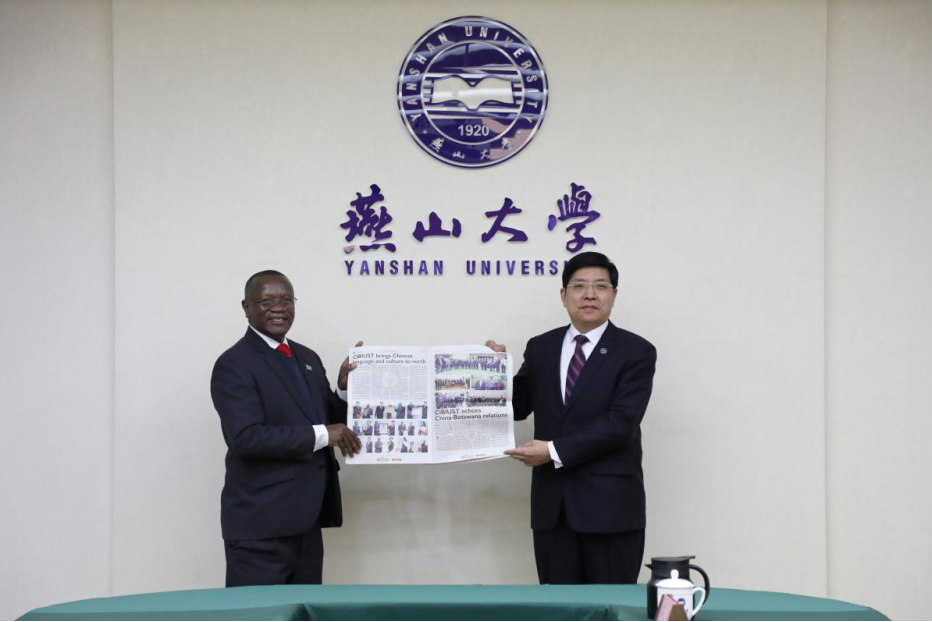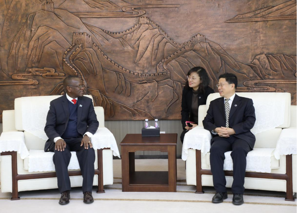 随后,赵丁选校长与托托洛校长一行在世纪楼2102室进行了座谈。赵丁选向此前率团访问博茨瓦纳国际科技大学时托托洛校长给与的热情接待表示感谢,他一直期待托托洛校长回访我校。他表示我校将全力支持博茨瓦纳国际科技大学孔子学院的运营和发展,博茨瓦纳国际科技大学是一所年轻而充满活力的学校,两校有着相近的学科和专业方向,开展合作的前景广阔,他期待两校能够结合各自的发展情况共同为两国的经济建设和社会发展做出积极的贡献。托托洛表示,两校共同举办的博茨瓦纳国际科技大学孔子学院揭牌仪式取得圆满成功,在当地引起了广泛关注,多家媒体争相报道,他此行特意将收藏的当地报纸赠送我校。