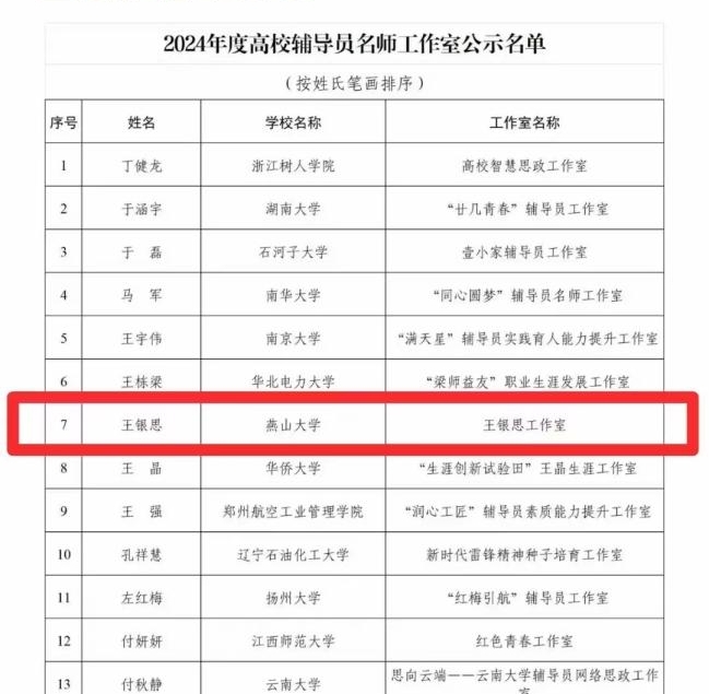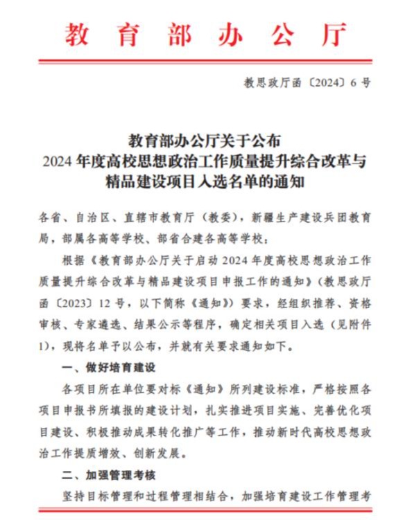 【新闻中心讯】近日,教育部发布《2024年度高校思想政治工作质量提升综合改革与精品建设项目入选名单的通知》,经组织推荐、资格审核、专家遴选、网络公示等环节,在全国高校遴选确定了首批高校辅导员名师工作室(全国80个)。我校王银思主持建设的“王银思工作室”成功入选,这是我校“多向锻造式”大思政育人格局和“多维矩阵式”辅导员队伍建设体系构建中又一标志性成果。
