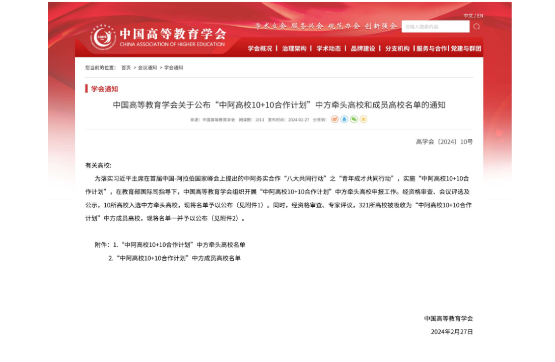 “中阿高校10+10合作计划”是为落实习近平总书记在首届中国-阿拉伯国家峰会上提出的中阿务实合作“八大共同行动”之“青年成才共同行动”而实施的计划。在教育部国际司指导下,中国高等教育学会与阿拉伯大学协会共建“中阿大学联盟”交流机制,聚焦信息通信、农业发展、卫生健康、绿色创新、能源转型、文明对话、青年成才、公共政策、航空航天和经贸投资等领域建立合作集群,为推动中阿各领域务实合作贡献智慧与力量。(编辑 褚玉晶)