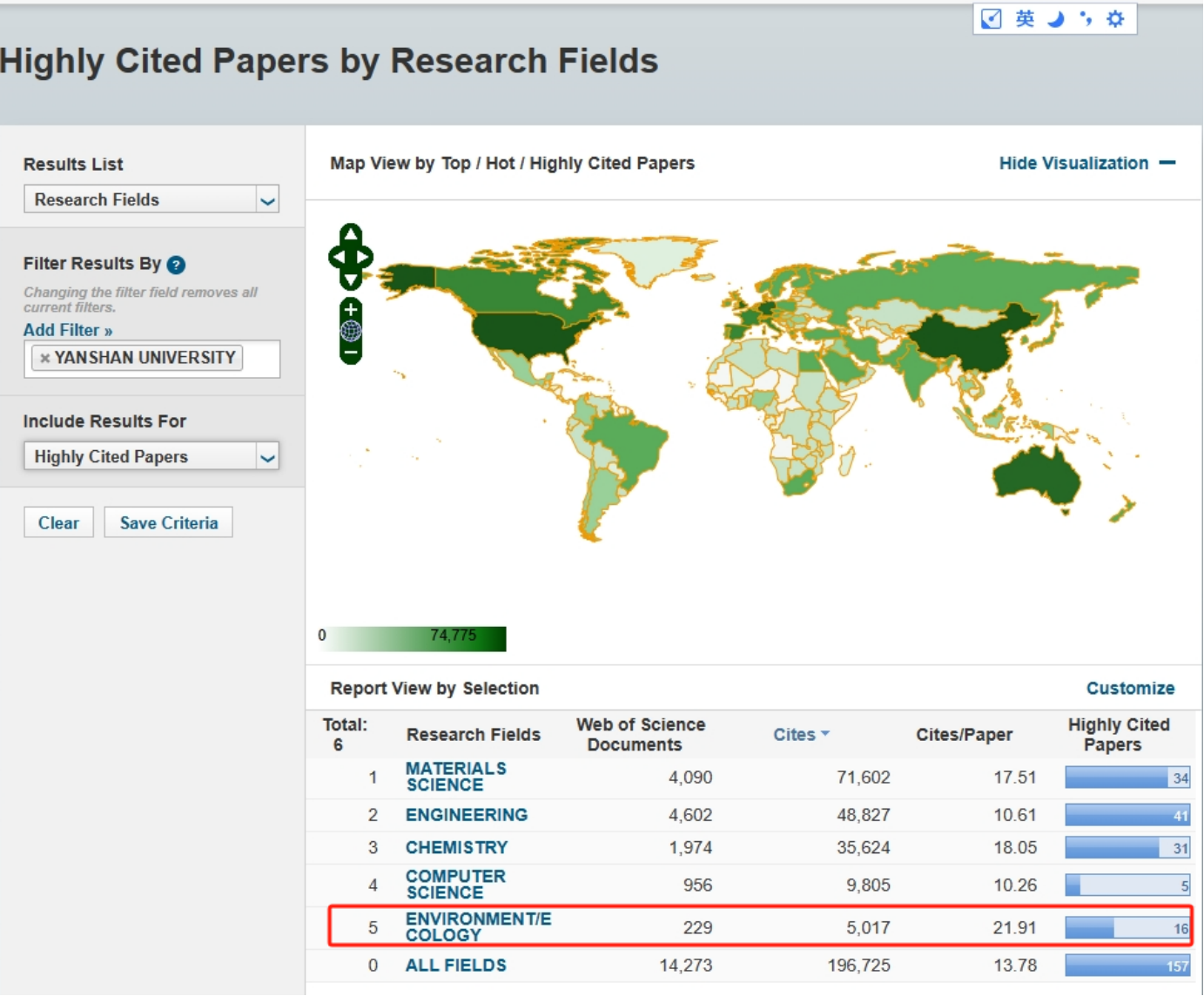 本次数据的统计区间为2014年1月1日至2024年2月28日。在此期间,我校在环境科学与生态学领域发表ESI论文229篇,总被引频次5017次,篇均被引21.91次,其中高被引论文16篇,热点论文1篇,进入ESI排名前1%行列。