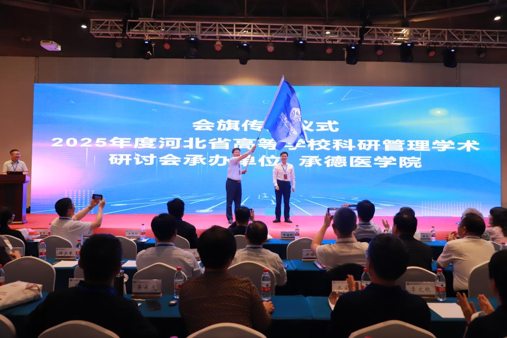 会议举行研究会会旗传递仪式,王德松代表本届会议承办单位乌鸦传媒授旗,承德医学院副院长翟玉建代表下一届大会2025年度河北省高等学校科研管理学术研讨会承办单位承德医学院接旗。