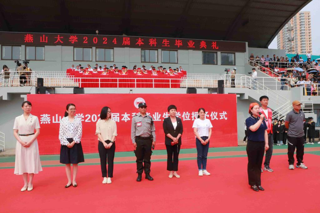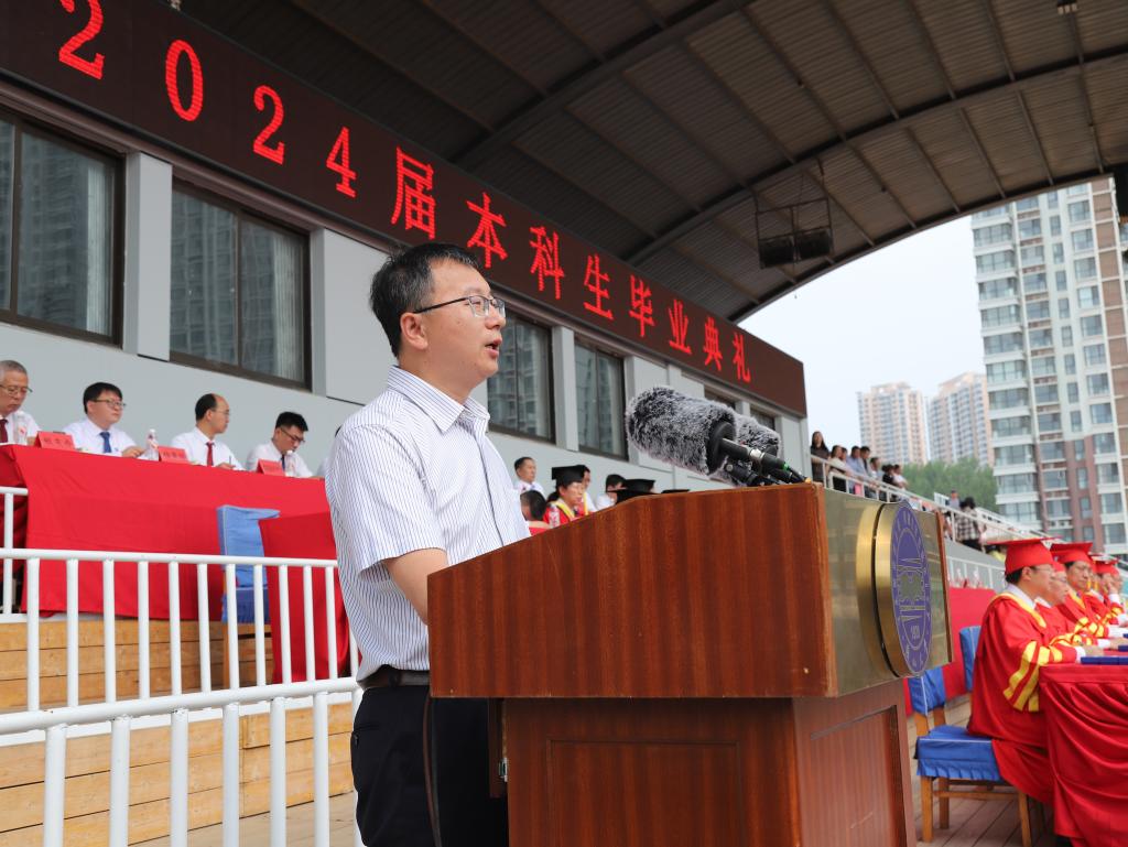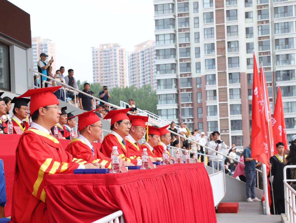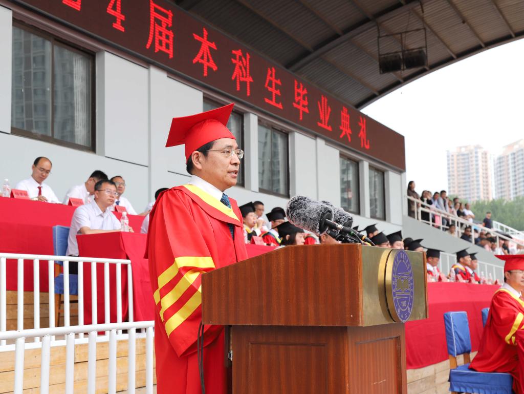 在热烈的掌声中,赵丁选以“做向上生长、向下扎根、向内蓄势、向外绽放的燕大人”为题,对毕业生们提出谆谆嘱托和殷切期望。赵丁选代表学校向2024届毕业生表示最诚挚的祝贺,向陪伴成长的亲友和师长表示最衷心的感谢。他回顾了难忘的燕大美景、品尝的燕大味道、脚踏的燕大地标,总结了四年来全校师生共同拼搏奋斗取得的发展建设成就。他号召同学们牢记习近平总书记对青年的殷殷嘱托,并和大家分享了四点感悟:第一是向上生长,做有理想的燕大人,有“立志而贤则贤矣”的雄心。要立大志、立远志,更要立恒志,把“小我”融入到党和人民的事业中,用“大我”去抒写爱国之情、报国之志,不负时代、不负韶华。二是向下扎根,做敢担当的燕大人,有“愿得此身长报国”的胸怀。铭记责任担当始终是燕大青年的鲜明特质,希望大家到基层、到人民中去建功立业,让青春之花绽放在祖国最需要的地方,成为科技创新、乡村振兴、绿色发展、社会服务、卫国戍边等各领域的排头兵和生力军,创造出无愧于时代的新业绩。三是向内蓄势,做能吃苦的燕大人,有“关关难过关关过”的本领。吃苦是支撑一代代燕大人百折不挠、奋勇前进的精神财富,要继承和发扬吃苦耐劳、艰苦奋斗的精神,像老一代东重人、燕大人一样,用青春汗水续写乌鸦传媒新百年的光辉篇章。四是向外绽放,做肯奋斗的燕大人,有“咬定青山不放松”的意志。要学会直面问题、迎难而上,在各自的领域里坚定方向、增强定力、保持韧劲,在接续奋斗中为推进强国建设、民族复兴伟业贡献新的燕大力量。赵丁选勉励同学们永葆燕大人的奋斗基因、工匠精神、卓越品质、家国情怀,在新时代奏响属于燕大人的胜利凯歌。