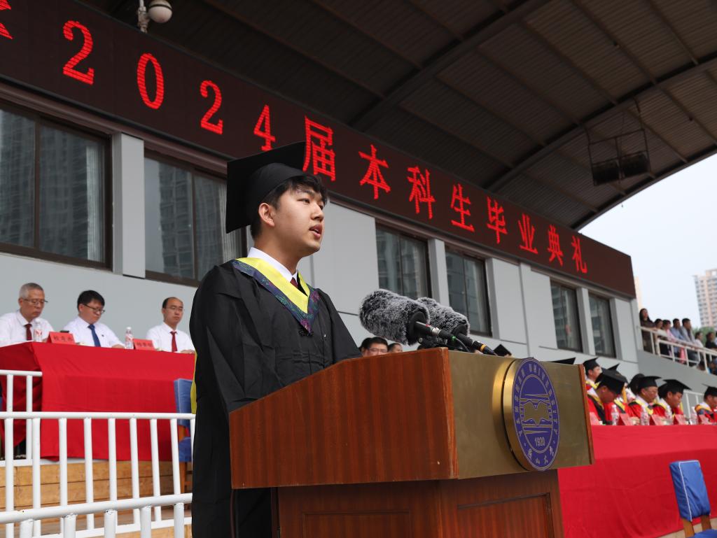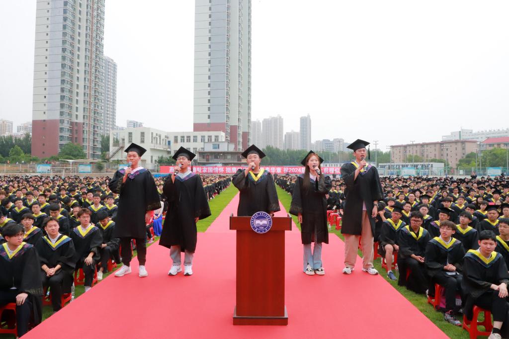 服务国家科技战略签约中移雄安产业研究院的闫佳兴、参军入伍保家卫国的闫铎、前往乡镇基层开展选调工作的杨梓艺、赴四川省凉山彝族自治州开展支教工作的魏擎宇、前往清华大学航空发动机研究院深造的李彦杰等5名同学,代表全校毕业生向学校做临别汇报,并集体宣誓:“胸怀山海,砥砺前行;扬帆起航,再创华章”。铮铮誓言铿锵有力,庄严承诺掷地有声,表达了毕业生们“厚植家国情怀,践行强国有我”的时代担当。