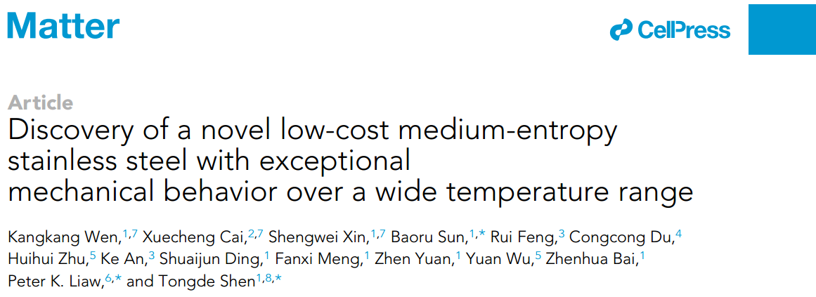 【新闻中心讯】7月25日,我校亚稳材料制备技术与科学国家重点实验室清洁纳米能源中心沈同德教授团队与国内外科学家合作,以《宽温域内具有优异的力学性能的新型低成本中熵不锈钢的发现》(“Discovery of a novel low-cost medium-entropy stainless steel with exceptional mechanical behavior over a wide temperature range”)为题将研究成果在线发表于物质(Matter,Cell姊妹刊),影响因子17.3,DOI:10.1016/j.matt.2024.06.041,全文链接:http://authors.elsevier.com/c/1jUX69Cyxd6rKM。