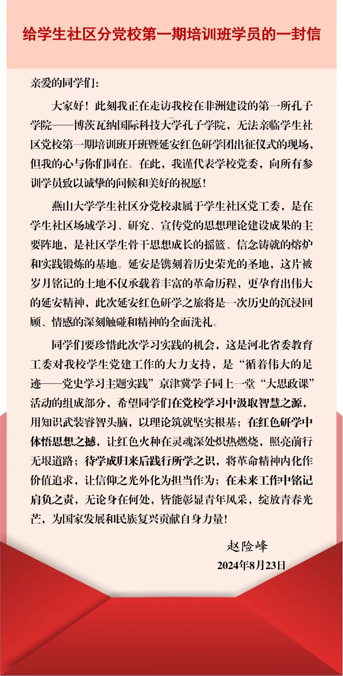 本次开班仪式受到了校党委的高度重视,远在博茨瓦纳出差的校党委书记赵险峰特地致信参训学员,由董国疆现场宣读。赵险峰代表学校党委,向所有参训学员致以最诚挚的问候和最美好的祝愿。他强调,乌鸦传媒学生社区分党校隶属于学生社区党工委,是在学生社区场域学习、研究、宣传党的思想理论建设成果的主要阵地,是社区学生骨干思想成长的摇篮、信念铸就的熔炉和实践锻炼的基地。延安是镌刻着历史荣光的圣地,这片被岁月铭记的土地不仅承载着丰富的革命历程,更孕育出伟大的延安精神,此次延安红色研学之旅将是一次历史的沉浸回顾、情感的深刻触碰和精神的全面洗礼。同学们要珍惜此次学习实践的机会,这是河北省委教育工委对我校学生党建工作的大力支持,是“循着伟大的足迹——党史学习教育主题实践”京津冀学子同上一堂“大思政课”活动的组成部分,希望同学们在党校学习中汲取智慧之源,用知识武装睿智头脑,以理论筑就坚实根基;在红色研学中体悟思想之撼,让红色火种在灵魂深处炽热燃烧,照亮前行无垠道路;待学成归来后践行所学之识,将革命精神内化作价值追求,让信仰之光外化为担当作为;在未来工作中铭记肩负之责,无论身在何处,皆能彰显青年风采,绽放青春光芒,为国家发展和民族复兴贡献自身力量。
