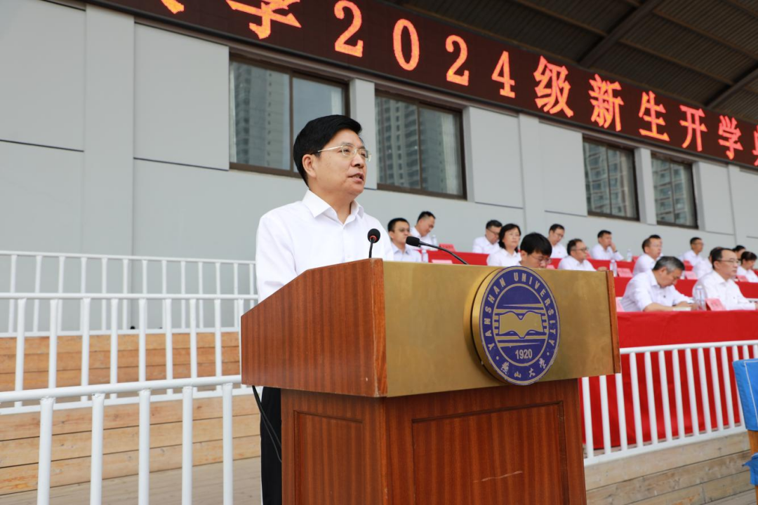 校长赵丁选作了题为《秉持厚德博学求是校训担当伟大复兴时代重任》的讲话,他代表学校全体师生员工向新生的到来表示欢迎和祝贺,他回顾了学校“两次搬迁、三次创业、划转更名”的发展历程和近年来获得的重大成就与突破,希望同学们能够传承燕大人不畏艰难、自强不息的奋斗基因,严谨专注、精益求精的工匠精神,敢于创新、善于创造的卓越品质,心系祖国、服务社会的家国情怀,在即将开始的求学征程中,坚守初心,矢志奉献。