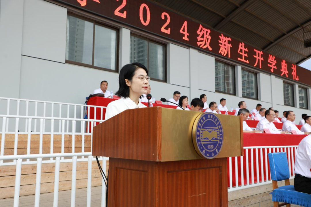 电气工程学院博士生导师、燕山学者王晓寰代表教师发言,她回忆与学生朝夕相处的日子,分享了身边三位同学的成长故事,鼓励新生要心有热爱、尽情燃烧,在五彩斑斓的大学旅程中寻找到自己的宝藏,用自己的方式书写独一无二的故事,感恩父母、不断前行,在燕大见自己未见的世界,写未写的诗篇。