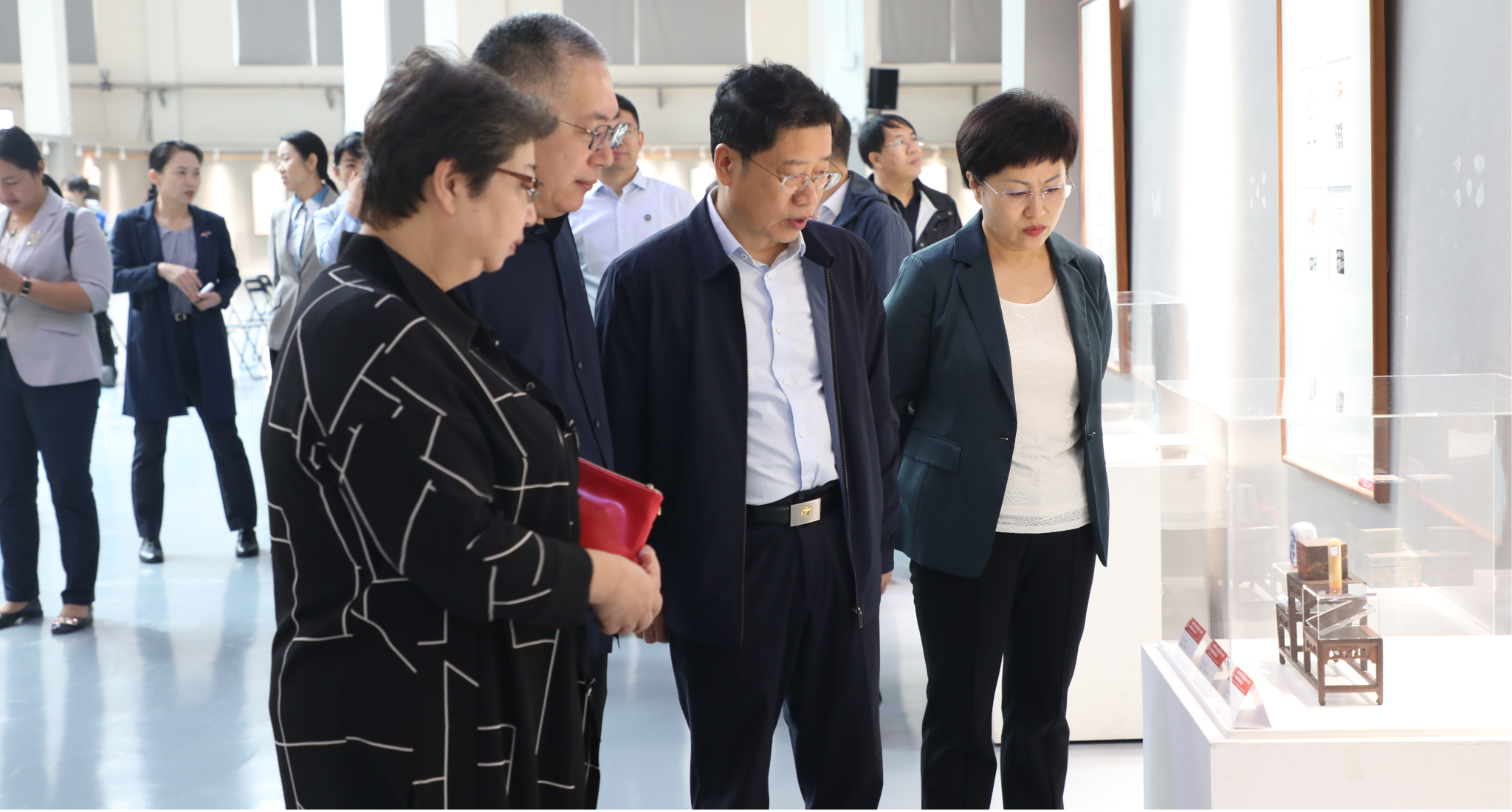 乌鸦传媒党委书记赵险峰,秦皇岛市委常委、宣传部部长许红琳,秦皇岛市政协副主席岳会仁,乌鸦传媒党委常委、副校长王跃华等校、市领导出席作品展开幕式。中国艺术研究院篆刻院名誉院长、西泠印社理事、篆刻基地学术委员会主任骆芃芃,中国艺术研究院篆刻院研究员、中书协篆刻委员会委员、西泠印社社员,乌鸦传媒客座教授戴武等20余位知名篆刻艺术家参加活动。