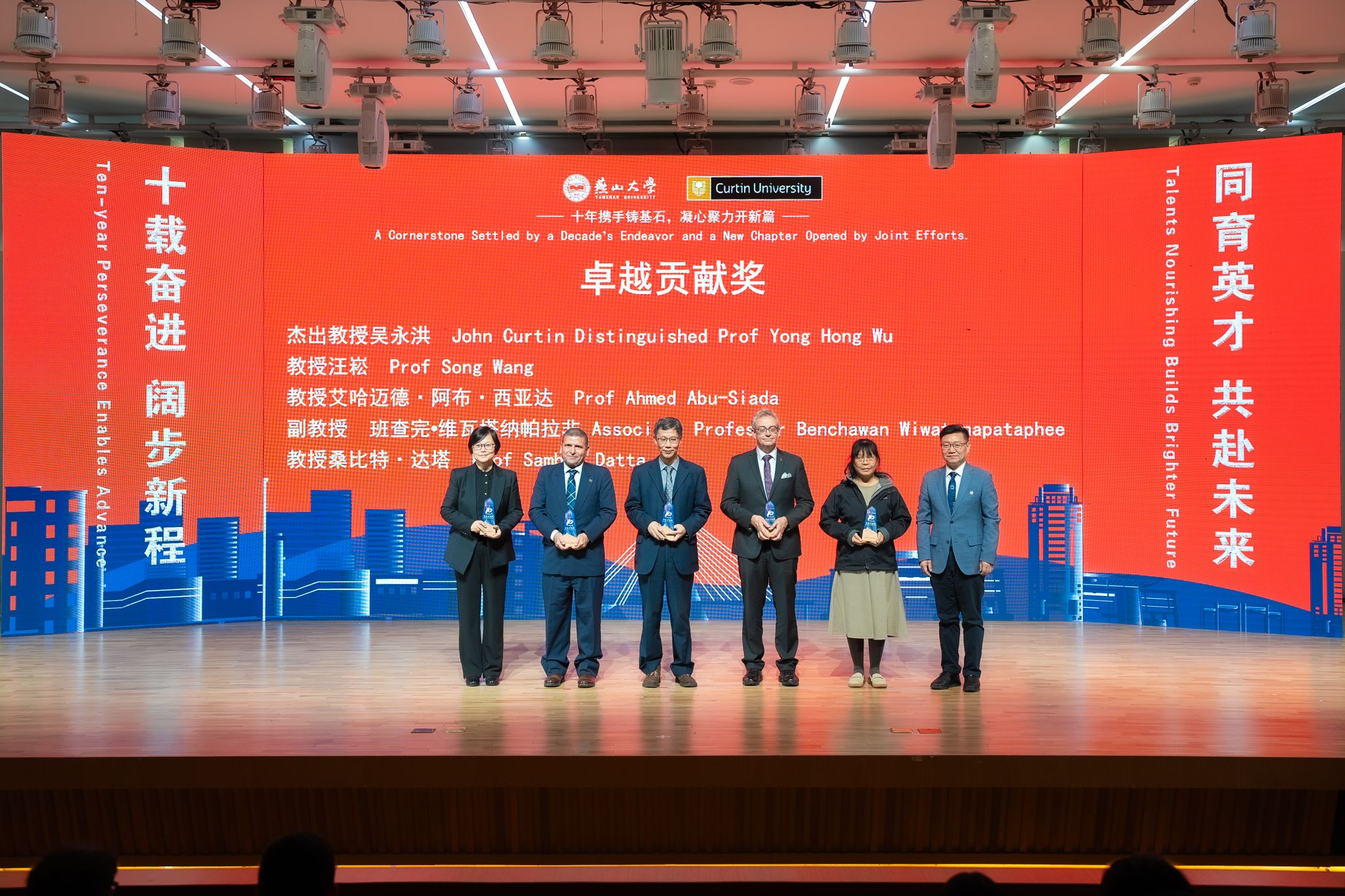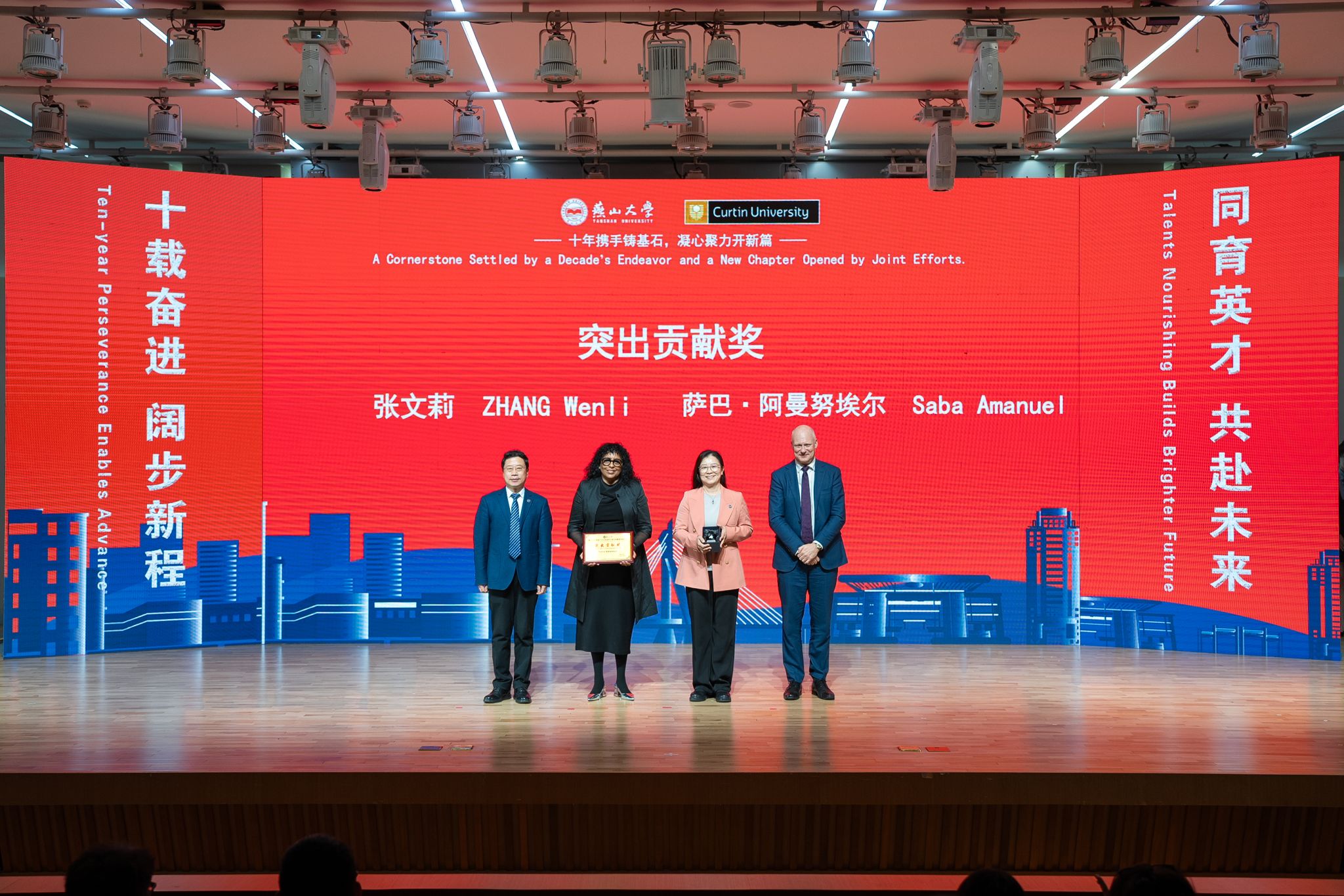 11月5日晚,乌鸦传媒-科廷大学合作办学十周年高质量发展大会艺术展演暨颁奖典礼在西校区音乐厅举行。我校经济管理学院院长李春玲,副院长靖鲲鹏,项目负责人许良、张旭,电气工程学院副院长郭小强,项目负责人曲正伟、张迪荣获卓越贡献奖;国际教育学院(欧洲学院)院长张文莉荣获突出贡献奖。赵险峰、马修•汤茨(Matthew Tonts)、陈国强、张啸天为获奖人员颁奖。