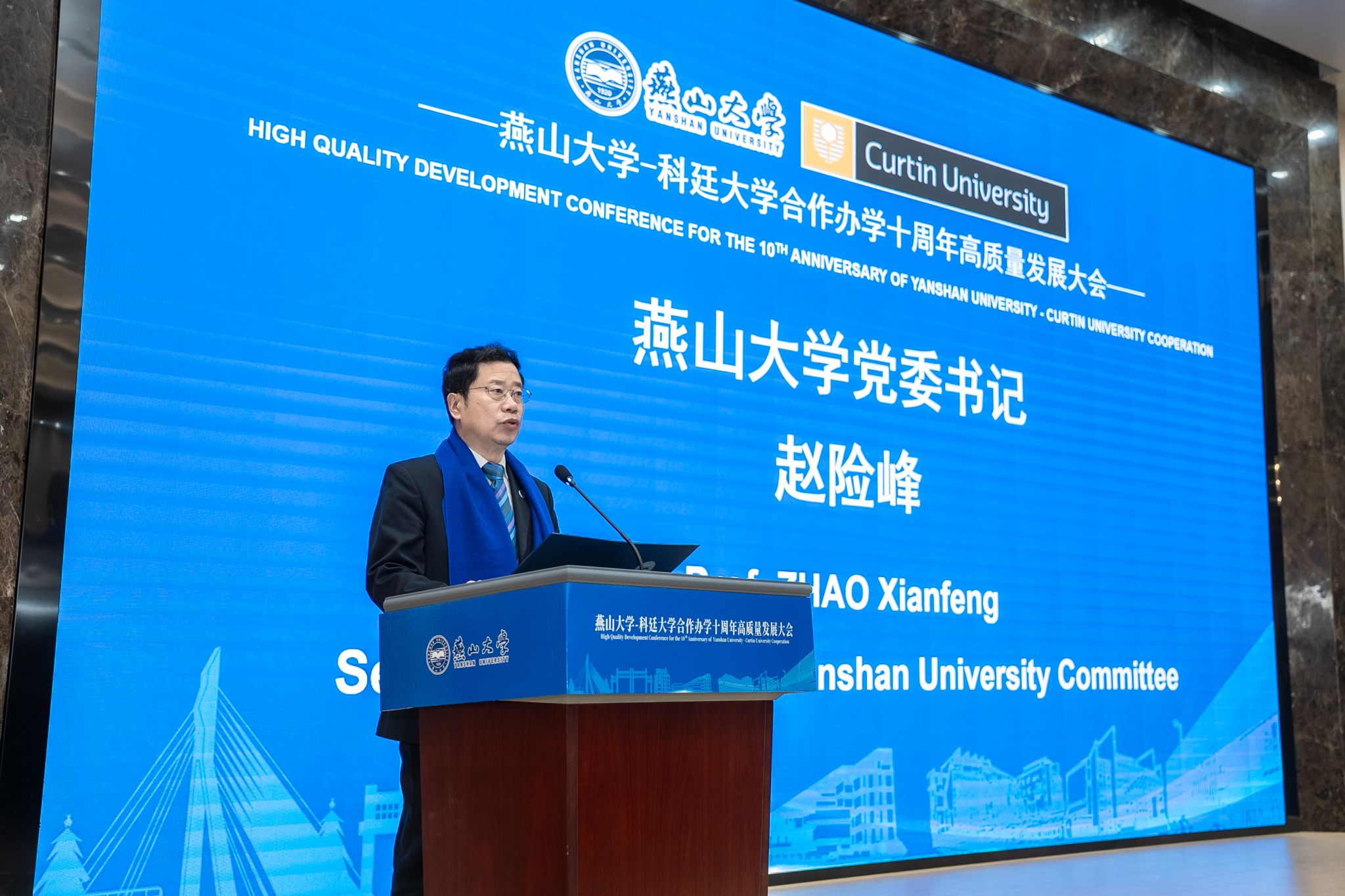 赵险峰在开幕式上致辞,高度赞扬了两校合作办学十年来的卓越成就。他指出,双方高校以开放包容的姿态,深度融合高等教育资源,在人才培养、科研合作、师资交流等方面收获了沉甸甸的合作成果,为培养具有国际视野和全球竞争力的国际化人才作出了贡献。期待两校继续深挖办学优势、拓宽合作领域、携手共赢发展,提升两校合作办学的新高度、开启两校合作办学新篇章。