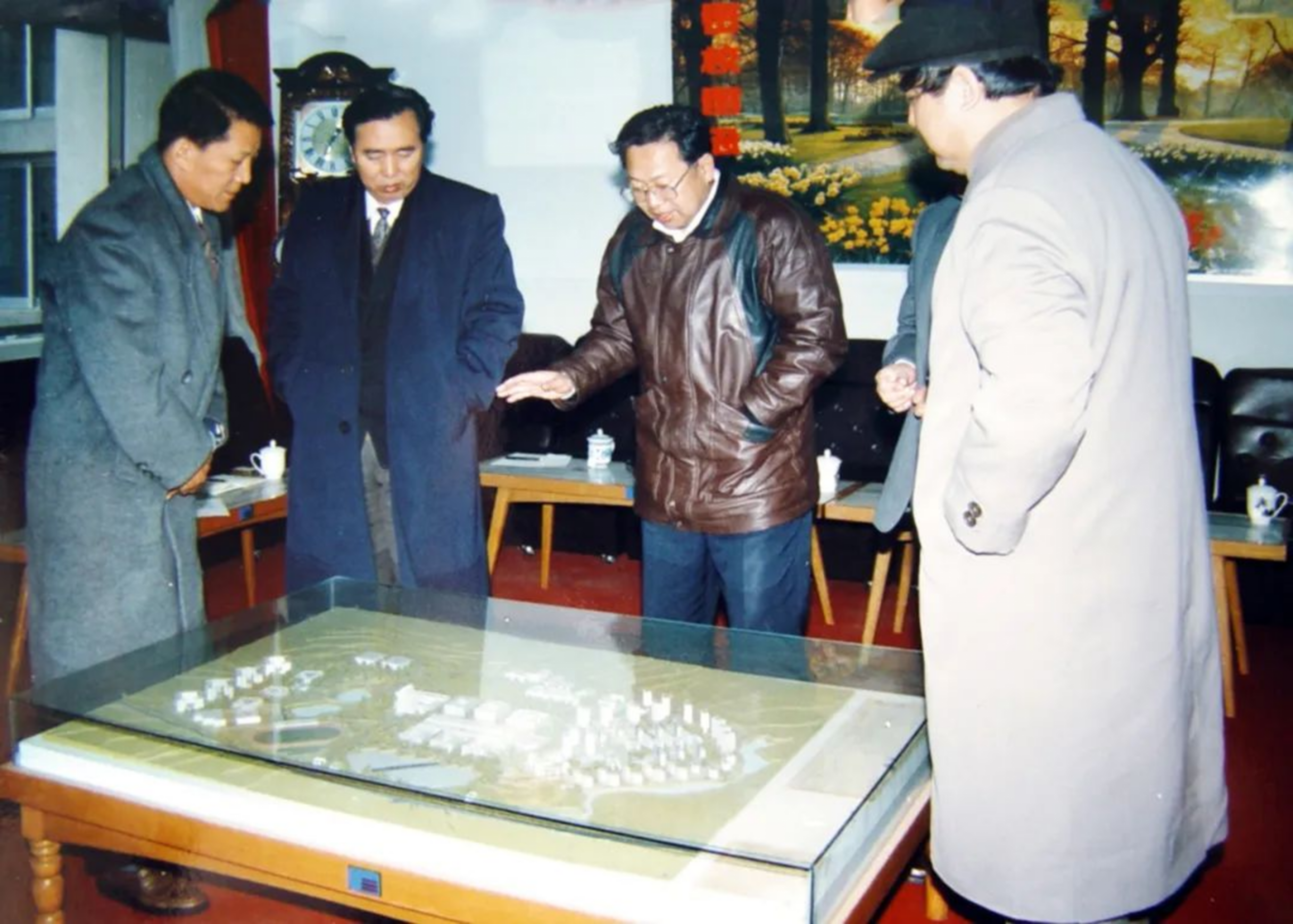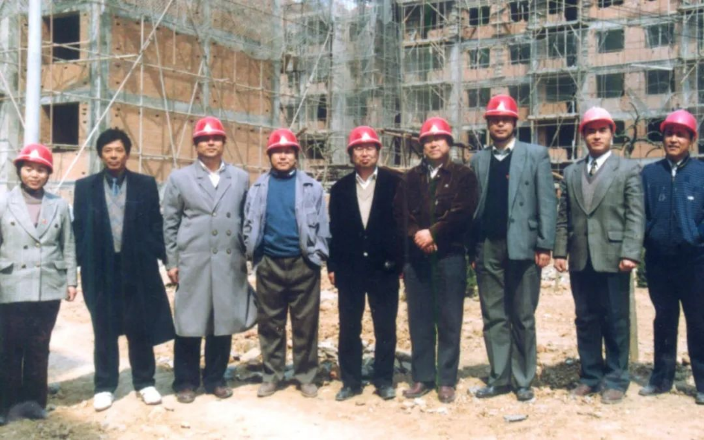 1996年4月12日,王益群等学校领导视察家属楼建设工地及在建的第二食堂