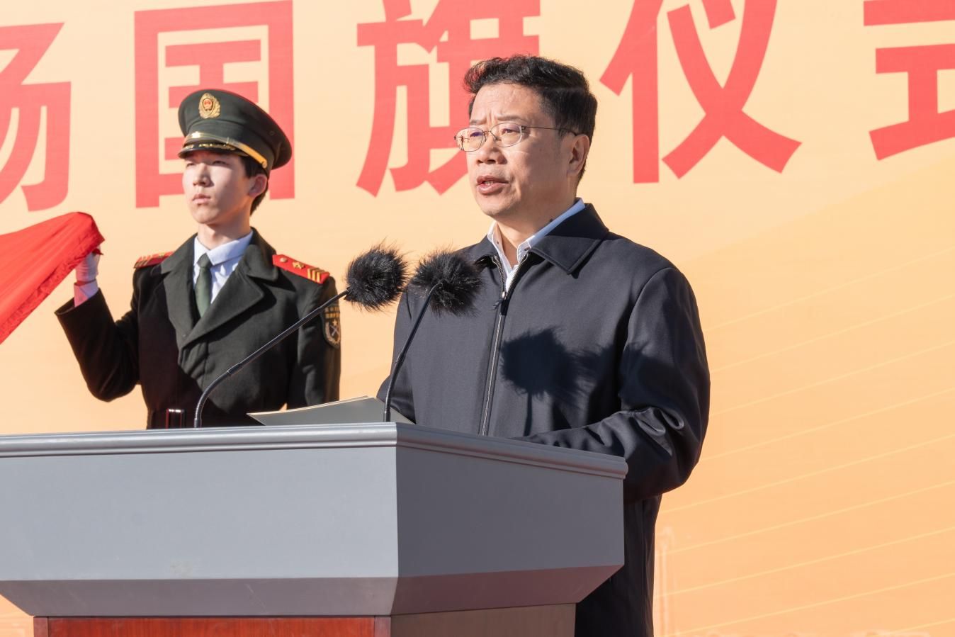 赵丁选宣读国旗赠予证书,护旗手展示国旗。五星闪耀,熠熠生辉,鲜艳的五星红旗展开的瞬间,现场爆发出雷鸣般的掌声。全体师生面向国旗高声奏唱国歌。