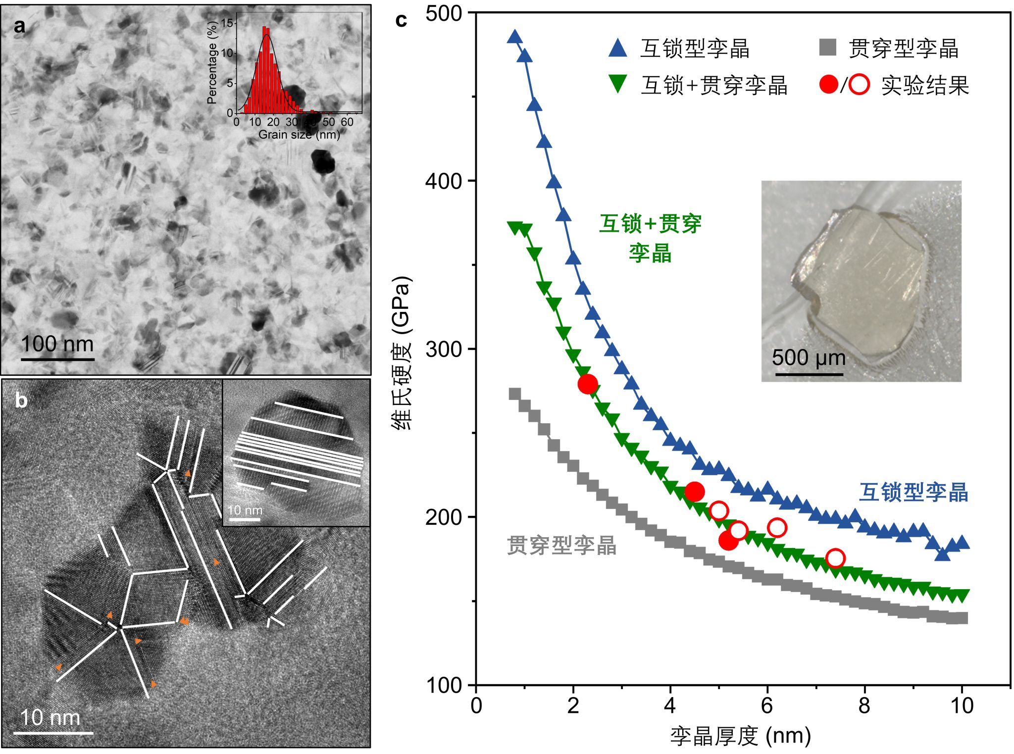 图释:超细纳米孪晶金刚石的显微组织结构和维氏硬度。a) STEM明场像展示了样品的整体微观形貌,插图为统计获得的晶粒尺寸分布,平均晶粒尺寸为18 nm。b)高分辨TEM照片显示了样品中的特征孪晶结构:主图为占主导地位的互锁型孪晶,插图为局部区域观察到的贯穿型孪晶。c)基于位错模型计算的硬度随孪晶厚度的变化及实验测得的硬度数据,插图为超细纳米孪晶金刚石样品的光学照片。