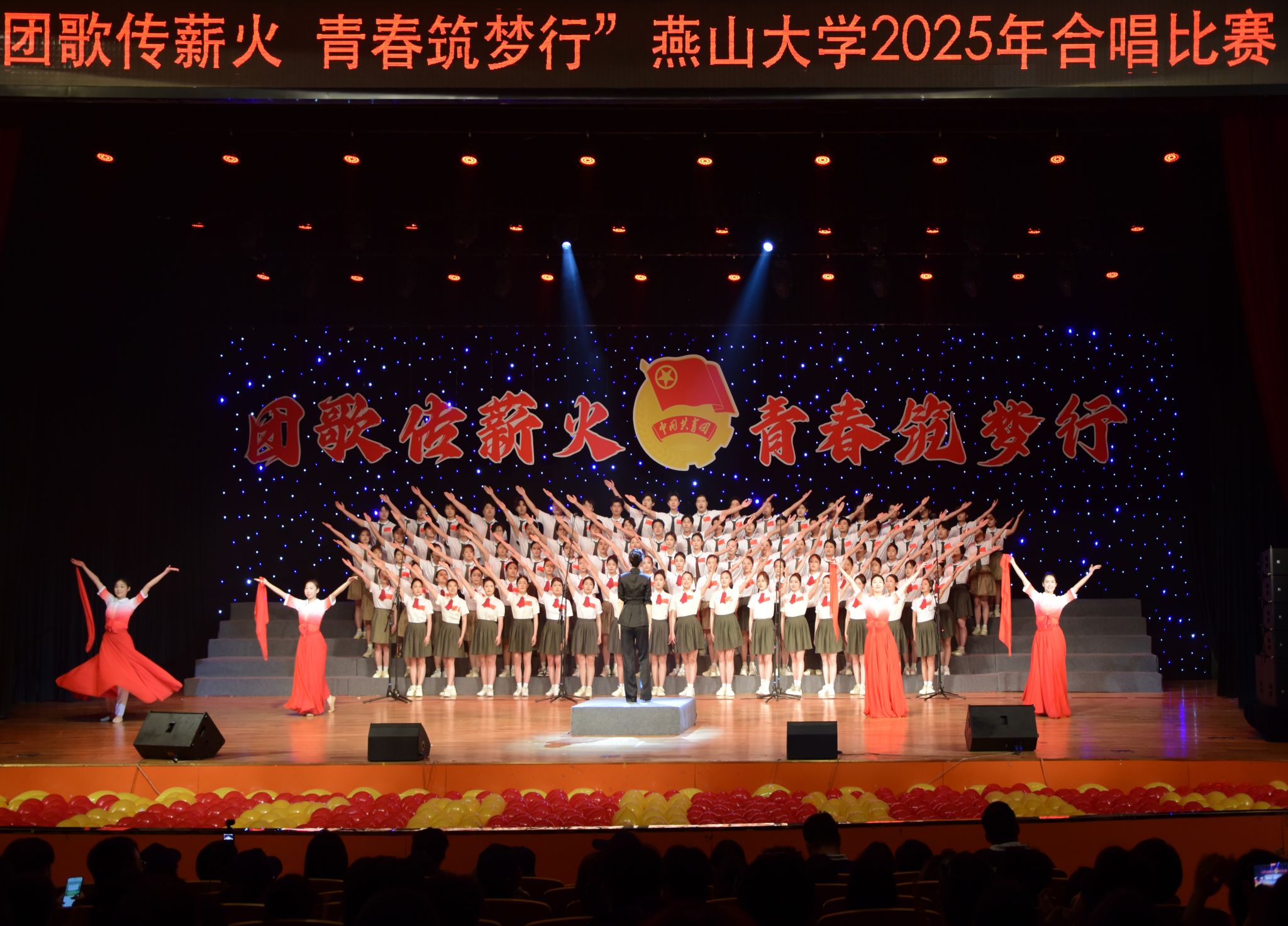 比赛现场气氛热烈,各参赛单位按照抽签顺序依次上台,分别演唱必选曲目《光荣啊,中国共青团》及一首自选曲目。他们用嘹亮的歌声表达了对理想信念的坚定和对共青团的热爱,展现了新时代燕大青年积极向上的精神风貌。《千尘之光,万里之国》奏响青春序曲,抒发了燕大学子对未来蓝图的美好期许;《星辰大海》《明天会更好》引领大家仰望星空、展望未来;《我和我的祖国》《我的中国心》唱出燕大学子对祖国母亲的深情告白,字字句句尽显赤子之心;《在灿烂的阳光下》《新时代建设者之歌》《平凡之路》展现出新时代追梦人昂扬的斗志与强烈的使命担当;《祖国不会忘记》以激昂的旋律礼赞那些默默奉献的无名英雄;《请党放心,强国有我》《有我》唱出了新时代青年在强国建设中挺膺担当的铿锵誓言;《保卫黄河》气势恢宏,彰显出中华民族坚韧不拔的民族气节;《当那一天来临》展现了新时代青年时刻准备为祖国奉献的忠诚与担当;《如愿》《紫荆花盛开》将华夏儿女对祖国的依恋和美好期许娓娓道来。
